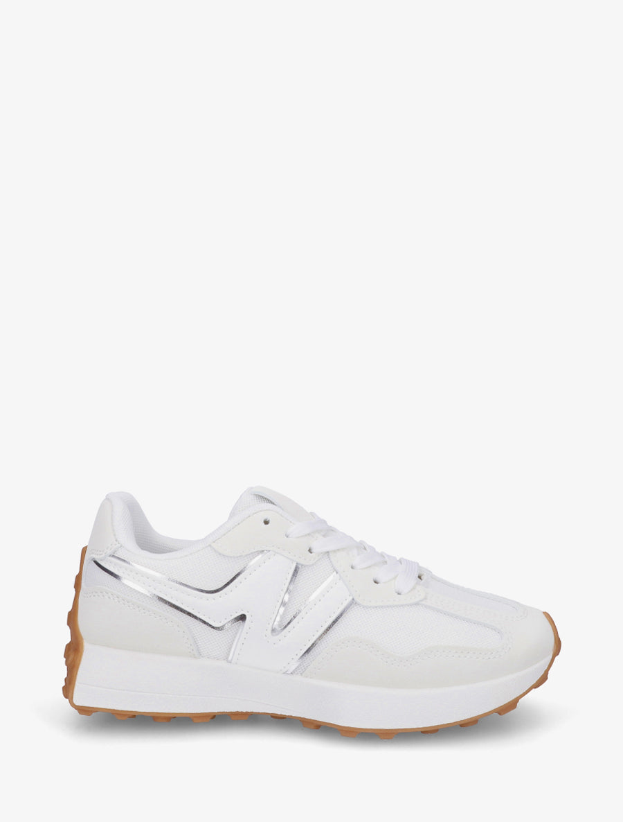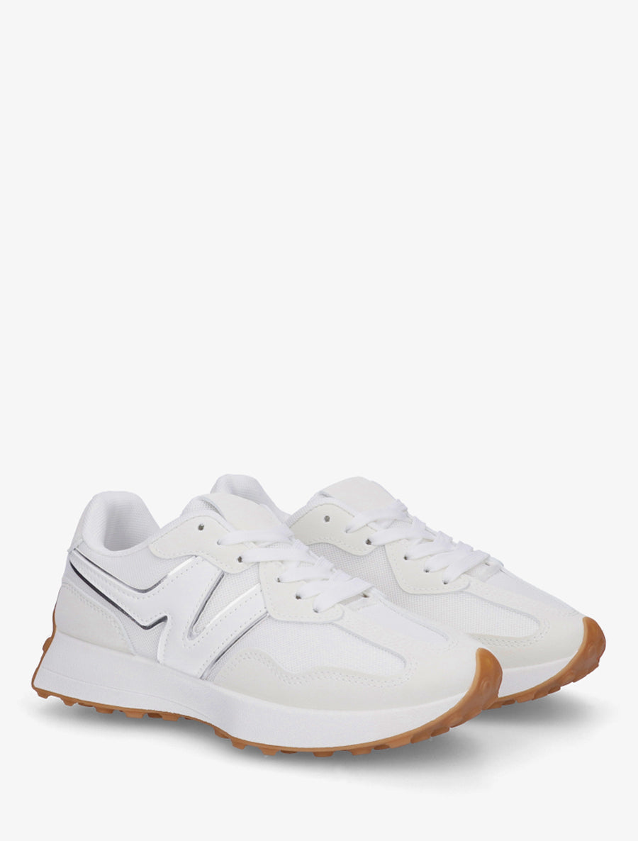 Adoptez un style urbain raffiné avec ces baskets bimatière qui conjuguent toile respirante et effet nubuck sophistiqué. Leur design blanc intemporel s'enrichit d'un détail irisé subtil qui capte la lumière à chaque pas. La semelle plate de 3 cm assure un confort optimal tout au long de la journée, tandis que les empiècements en maille garantissent une excellente aération. Les bouts ronds et le système de laçage classique offrent un ajustement parfait. Idéales pour vos déplacements quotidiens ou vos sorties décontractées, ces baskets en simili cuir s'accordent facilement à toutes vos tenues casual.