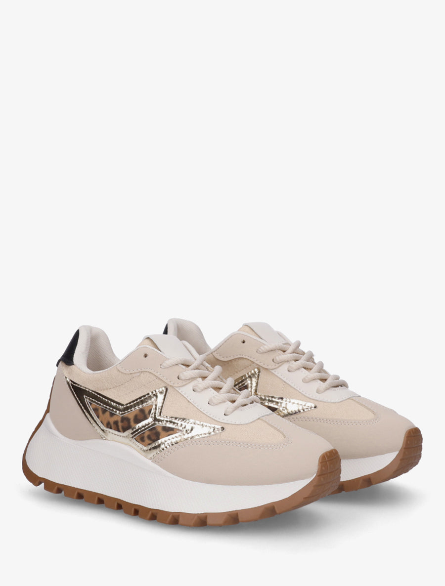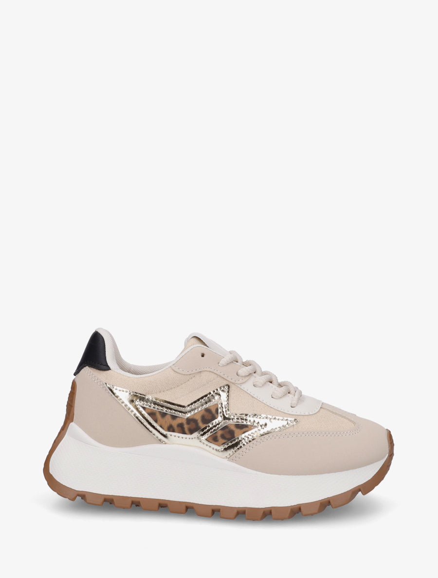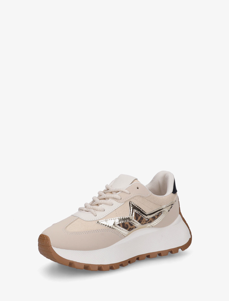 Affirmez votre style urbain avec ces baskets bi-matière qui allient confort et modernité. Leur plateforme de 5 cm apporte de la hauteur tout en garantissant une stabilité optimale. Le mélange audacieux d'empiècements effet nubuck, de détails irisés et d'imprimé léopard crée un look résolument tendance. Les bouts ronds et le système de laçage assurent un ajustement parfait pour vos journées actives. Confectionnées en simili cuir de qualité, ces baskets beiges se coordonnent facilement avec vos tenues décontractées comme plus habillées. Un essentiel polyvalent pour dynamiser votre garde-robe.