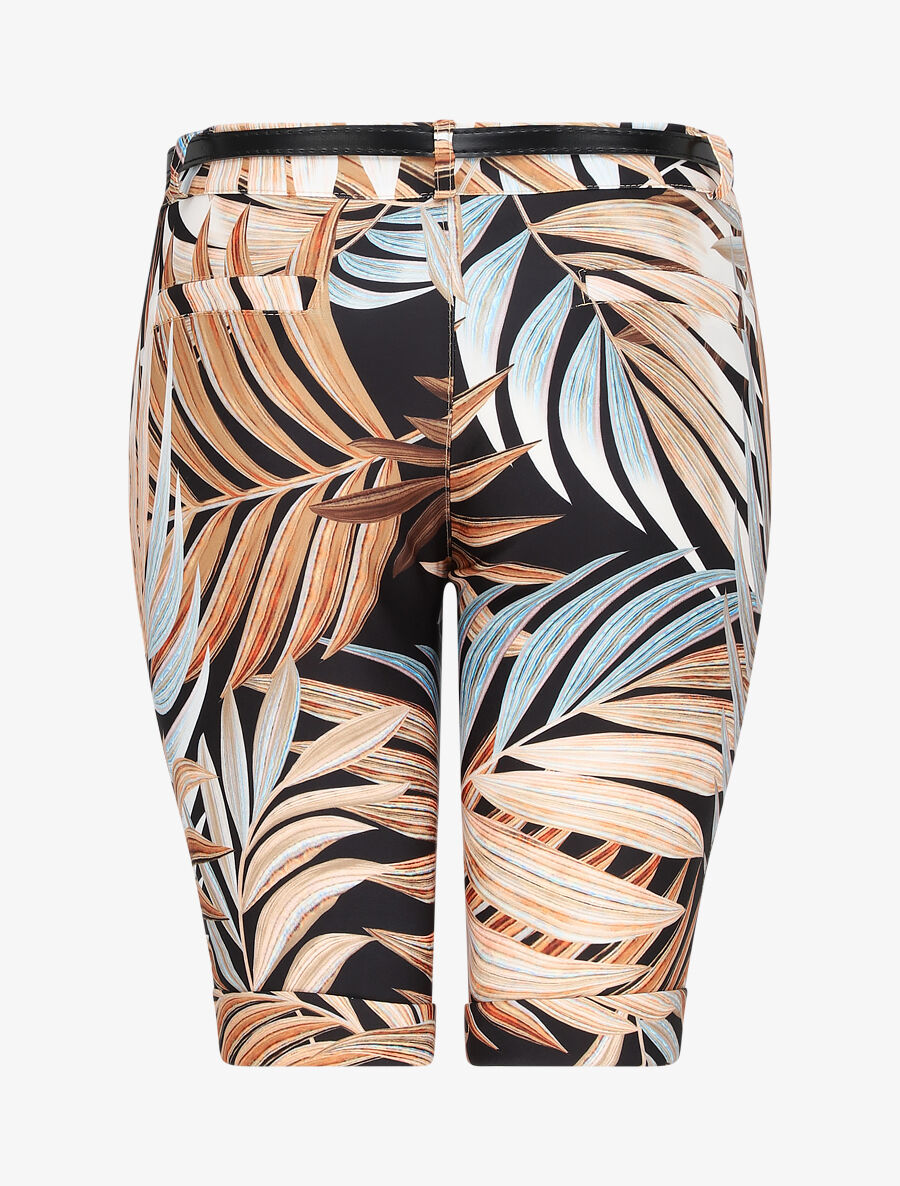 Ce bermuda camel à coupe droite taille haute sublime votre silhouette avec son imprimé feuilles tropicales raffiné. Confectionné en Italie, il associe élégance et confort grâce à sa composition stretch. Les bords à ourlets structurent la ligne tandis que la ceinture en simili incluse affine la taille. Doté de deux poches avant fonctionnelles et deux poches plaquées décoratives à l'arrière, il se ferme par zip et bouton. Une pièce estivale polyvalente qui s'adapte aussi bien aux escapades ensoleillées qu'aux journées décontractées en ville.