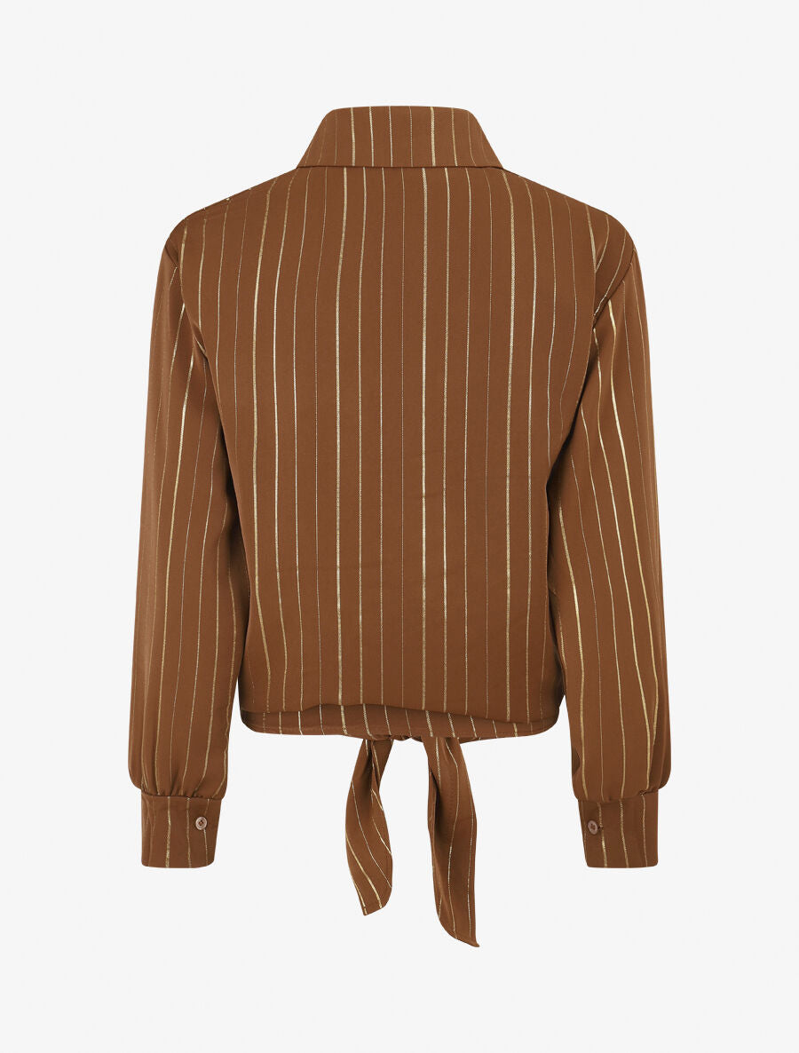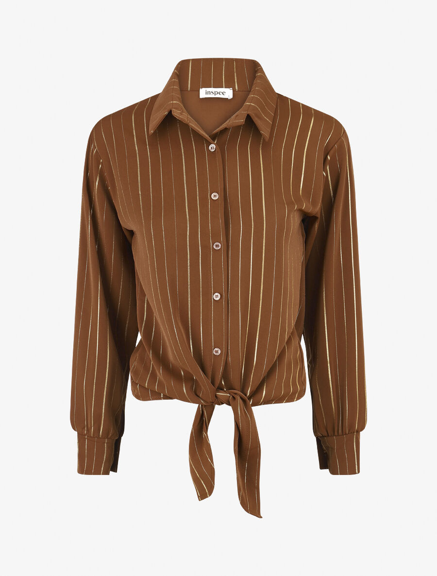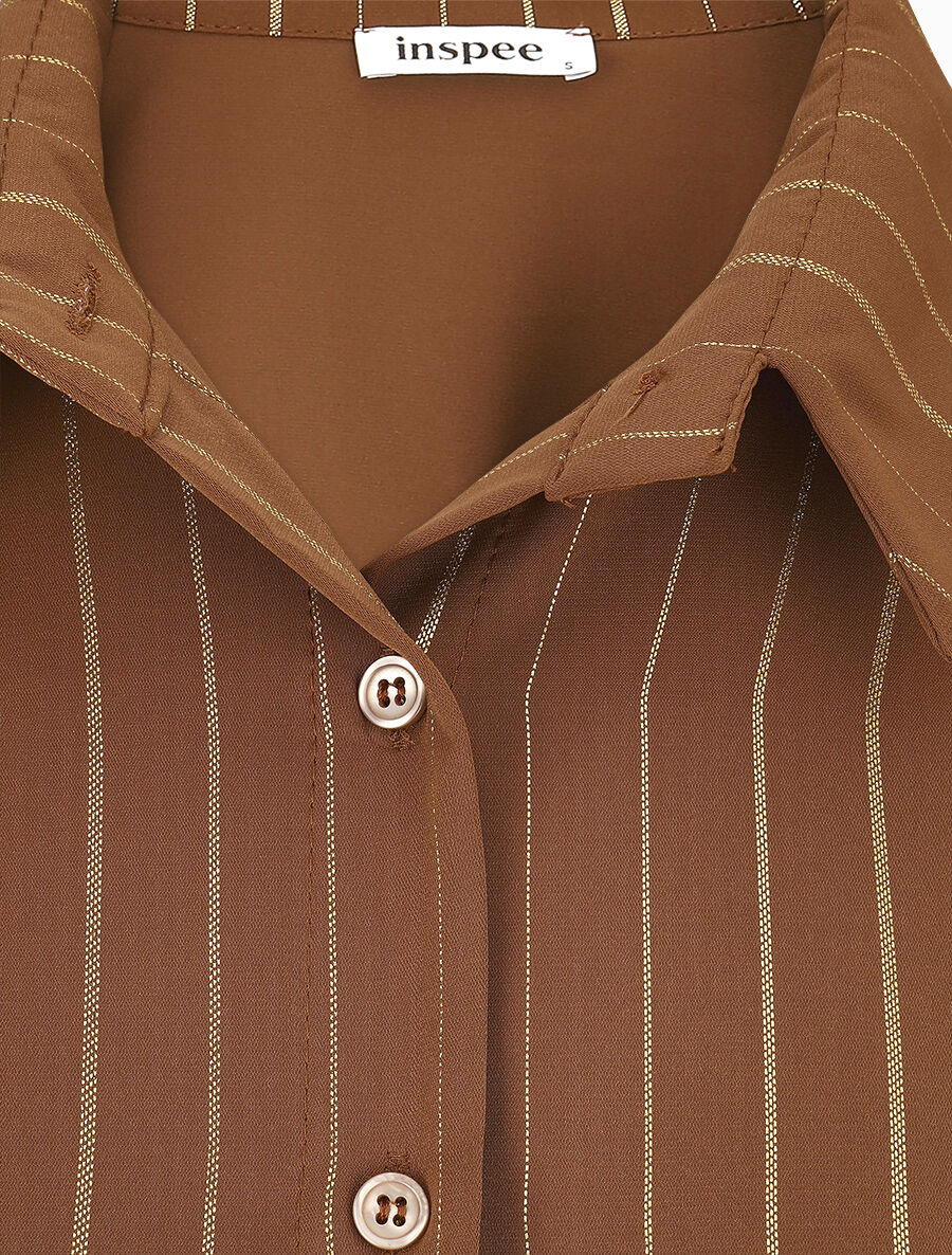 Découvrez cette blouse marron à la coupe droite sophistiquée, sublimée par des rayures irisées qui captent la lumière avec élégance. Son col à pied structure la silhouette tandis que les manches longues boutonnées apportent une touche raffinée. Les pans à nouer permettent d'ajuster la tenue selon vos envies pour un style personnalisé. Confectionnée en Italie avec un savoir-faire artisanal, cette pièce en polyester associe confort et allure moderne. La fermeture boutonnée complète ce modèle polyvalent, idéal pour vos journées professionnelles comme vos sorties décontractées.