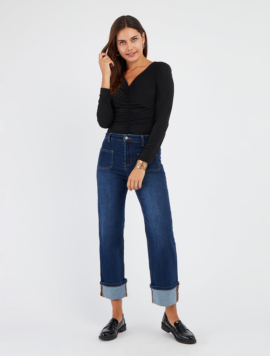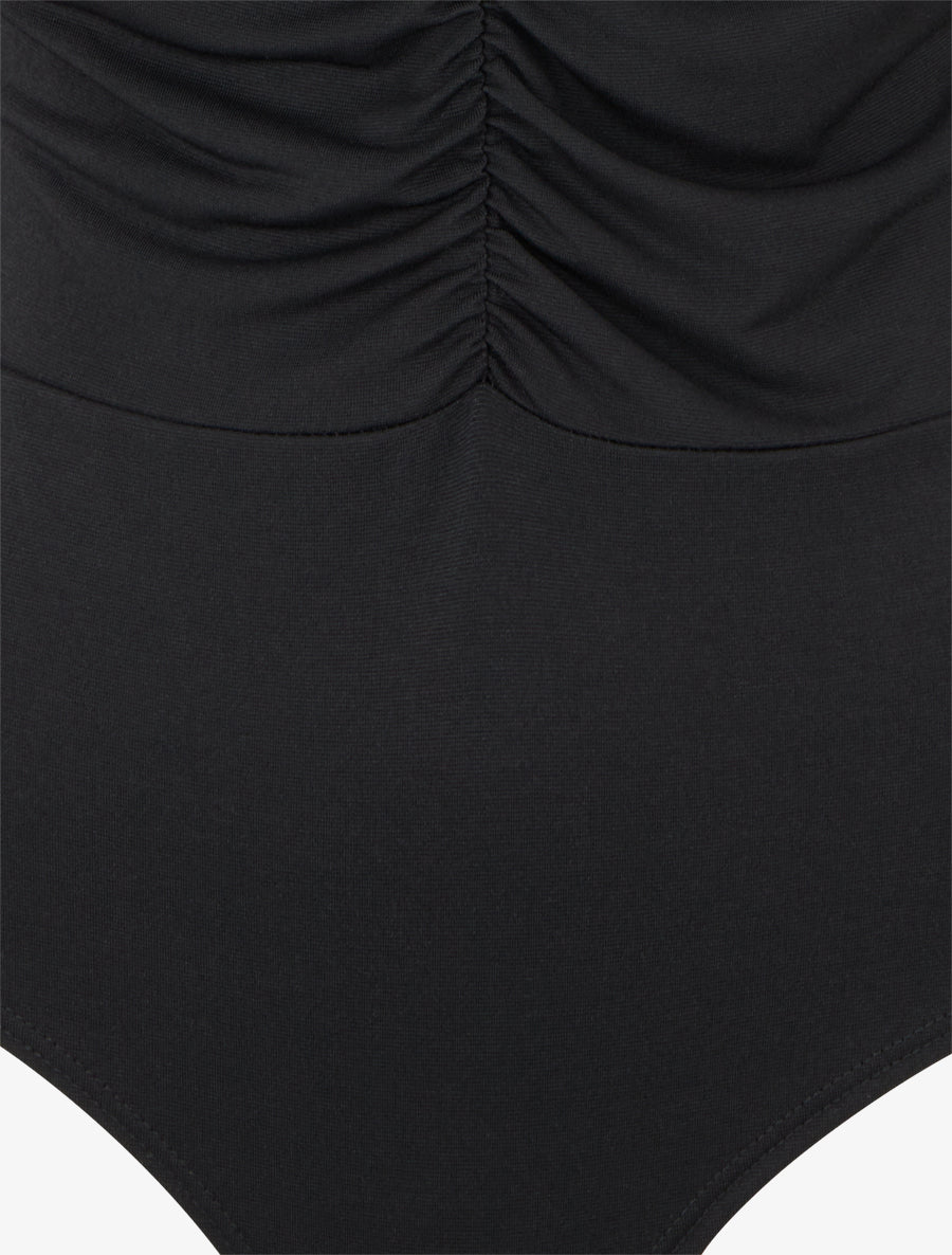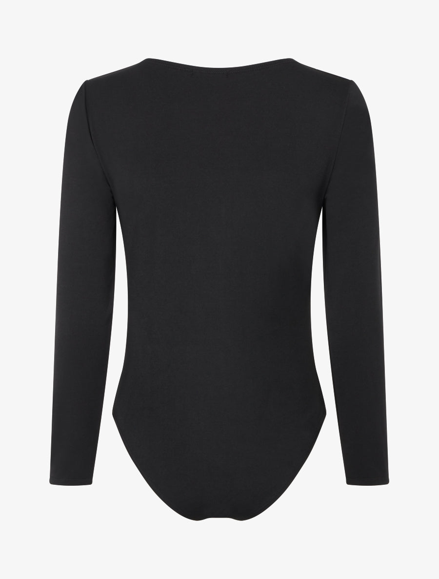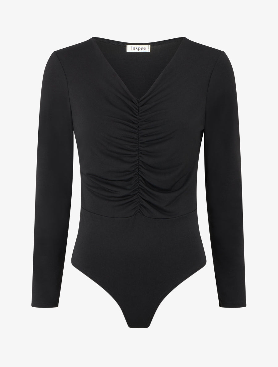 Ce body noir en maille stretch offre une coupe moulante qui sublime la silhouette avec élégance. Son col V froncé apporte une touche féminine raffinée, tandis que les manches longues assurent un style sophistiqué. La fermeture par agrafes à l'entrejambe garantit un confort optimal et un maintien parfait tout au long de la journée. Confectionné en Italie avec un savoir-faire reconnu, ce body de 68 cm se porte aussi bien avec un pantalon taille haute qu'avec une jupe crayon pour un look moderne et structuré au quotidien comme en soirée.