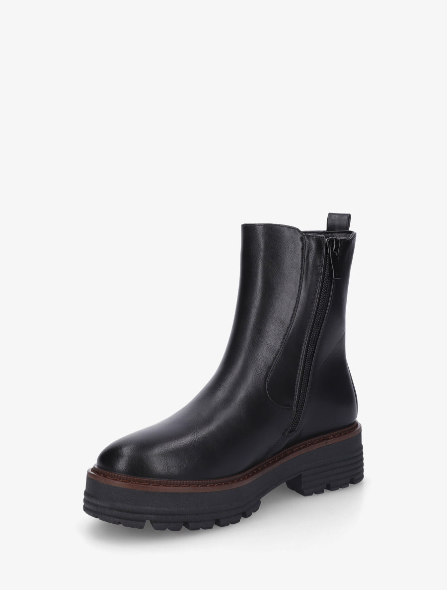 Adoptez un style affirmé avec ces boots en simili cuir noir à la silhouette structurée. Leur tige de 16 cm gainante se distingue par une cheville élastiquée qui assure un maintien optimal et un enfilage facilité. Le talon bloc de 4 cm offre stabilité et confort tout au long de la journée. La semelle crantée garantit une adhérence parfaite, tandis que le contrefort à anneau métallique apporte une touche moderne. La fermeture zippée intérieure à la cheville permet un ajustement précis. Parfaites pour compléter vos looks urbains avec caractère et praticité.