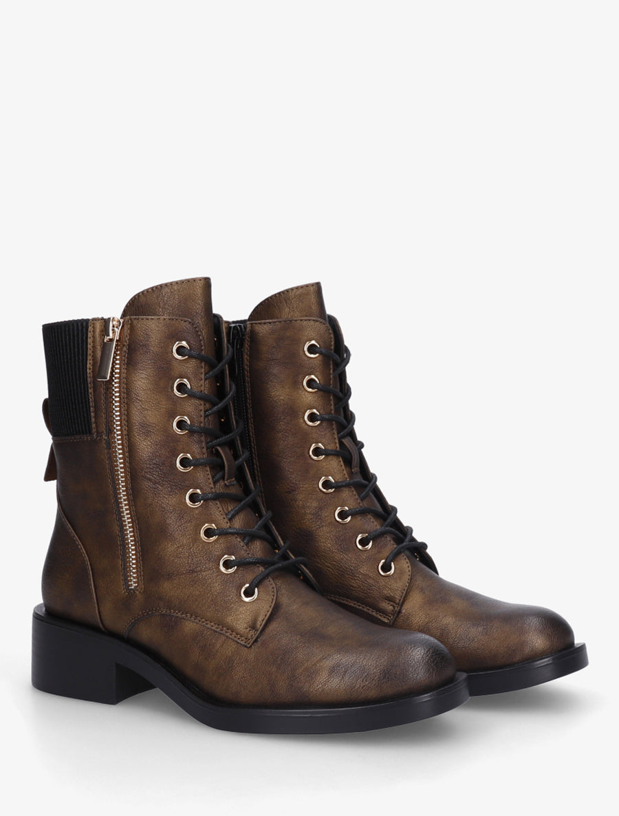 Ces boots montantes en simili nacré marron allient style urbain et confort au quotidien. Leur talon bloc de 4,5 cm assure une stabilité optimale, tandis que la tige de 15,5 cm sculpte élégamment la cheville. La fermeture zippée intérieure facilite l'enfilage, complétée par des lacets décoratifs pour un look affirmé. La cheville élastiquée côtelée garantit un maintien parfait et un ajustement confortable. Leurs bouts ronds et leur finition nacrée apportent une touche moderne à vos tenues automnales et hivernales.
