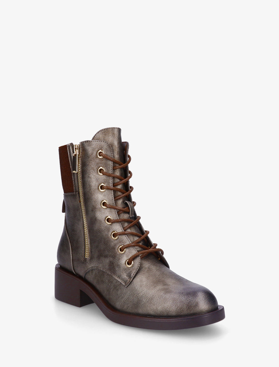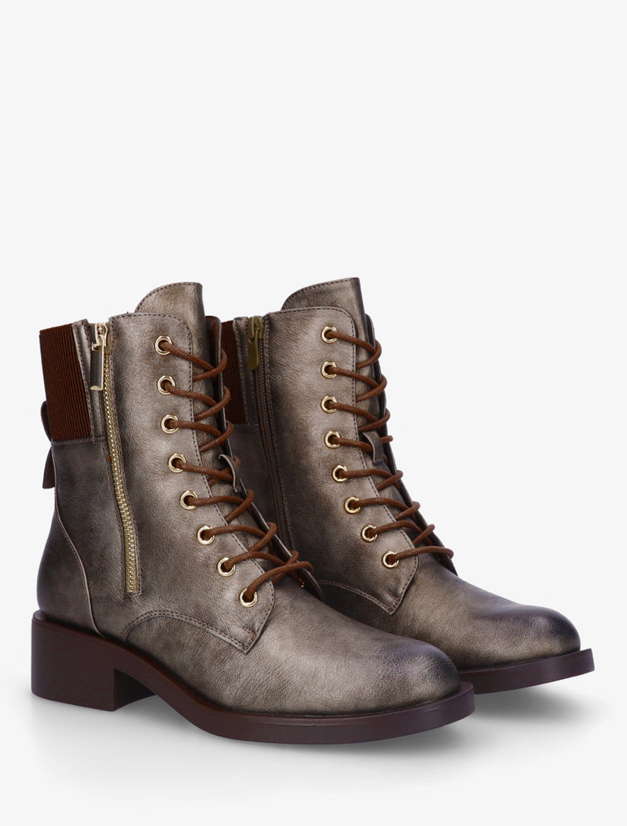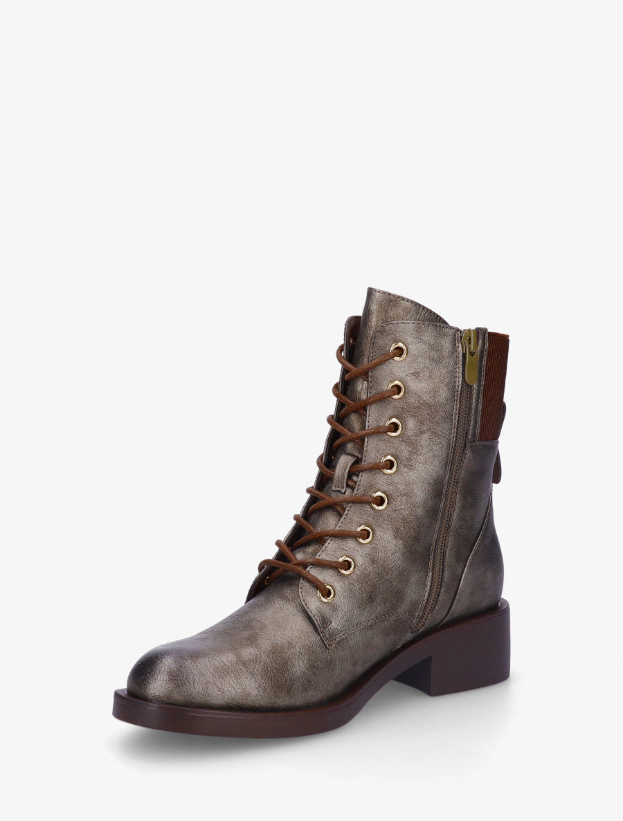 Ces boots montantes en simili nacré apportent une touche raffinée à votre garde-robe. Dotées d'un talon bloc de 4,5 cm et d'une tige de 15,5 cm, elles assurent confort et maintien optimal. La cheville élastiquée côtelée garantit un ajustement parfait, tandis que les lacets décoratifs et la fermeture zip intérieure facilitent l'enfilage. Leurs bouts ronds et leur finition bronze nacrée s'accordent aussi bien avec un jean qu'une robe pour un look urbain maîtrisé. Un modèle polyvalent qui traverse les saisons avec style.