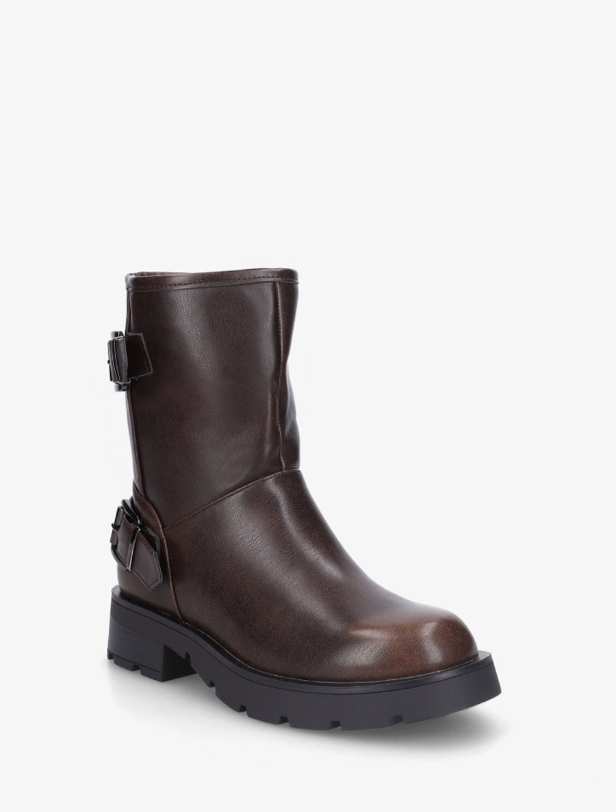 Ces boots motardes en simili cuir chocolat affichent un caractère affirmé avec leurs deux sangles à boucle au contrefort. Leur tige montante de 18,5 cm structure la silhouette tandis que le talon bloc de 4 cm et la semelle crantée garantissent stabilité et adhérence. La fermeture zippée intérieure à la cheville facilite l'enfilage. Leurs bouts ronds et leur finition soignée en font des alliées idéales pour vos looks urbains décontractés comme pour vos tenues plus rock. Un modèle polyvalent qui traverse les saisons avec style.