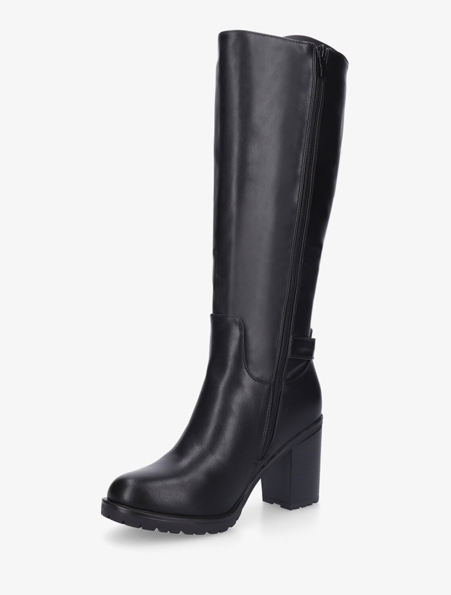 Ces bottes en simili cuir noir allient style urbain et confort optimal. Leur tige de 34 cm gainante se prolonge par un tour de mollet élastiqué de 32 cm pour un enfilage facilité. Le talon bloc de 8 cm assure stabilité et élégance au quotidien. L'empiècement cadenas métallique apporte une touche rock affirmée, tandis que la fermeture zippée intérieure garantit un chaussant pratique. Les bouts ronds complètent ce design moderne et polyvalent, parfait pour vos looks automnaux et hivernaux.