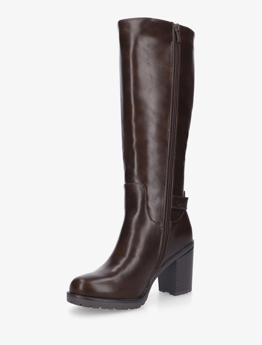 Ces bottes en simili cuir marron allient style urbain et confort optimal. Leur tige de 34 cm sublimée par un tour de mollet élastiqué de 32 cm assure un ajustement parfait. Le talon bloc de 8 cm offre stabilité et élégance, tandis que l'empiècement métallique cadenas apporte une touche moderne et audacieuse. La fermeture zippée intérieure facilite l'enfilage, et les bouts ronds garantissent un confort durable. Parfaites pour vos journées actives comme vos sorties en ville, elles s'accordent avec pantalons slim ou robes midi.
