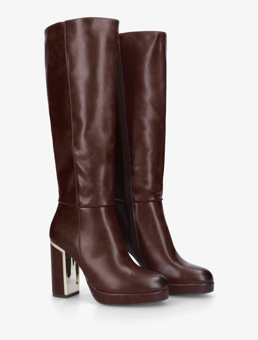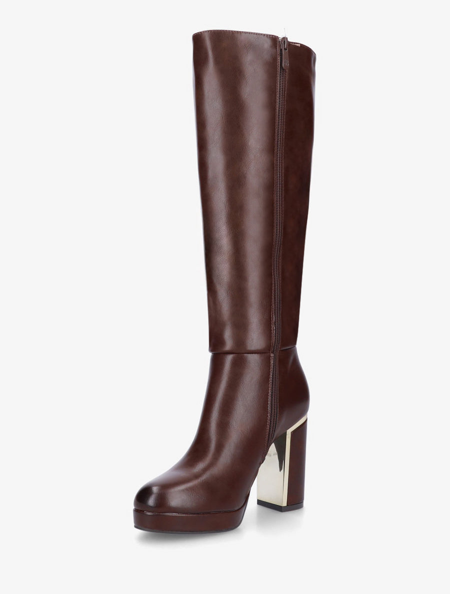 Adoptez l'allure sophistiquée avec ces bottes marron en simili cuir au caractère affirmé. Leur talon bloc de 10 cm rehaussé d'un empiècement métallique apporte une touche moderne et audacieuse. La tige haute de 37 cm sublime la silhouette, tandis que la fermeture zippée intérieure garantit un enfilage facile. Avec leurs bouts ronds et leur tour de mollet de 36 cm, ces bottes offrent confort et style pour toutes vos sorties automnales et hivernales. Un modèle incontournable qui s'accorde parfaitement avec jeans slim, robes midi ou jupes plissées.