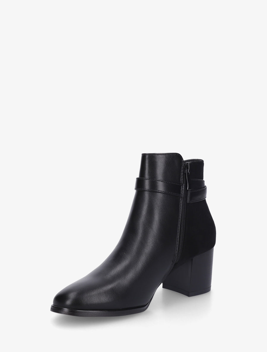 Ces bottines noires associent simili cuir et suédine pour un rendu bi-matière raffiné. Leur talon bottier de 6 cm et leur tige de 10,5 cm sculptent la silhouette avec élégance. La boucle métallique fantaisie à la cheville apporte une touche distinctive, tandis que la fermeture zippée intérieure garantit un enfilage pratique. Leurs bouts ronds assurent un confort optimal au quotidien. Parfaites pour sublimer vos tenues automnales et hivernales, elles s'accordent aussi bien avec un jean qu'une robe midi. Un modèle polyvalent qui allie style et praticité.