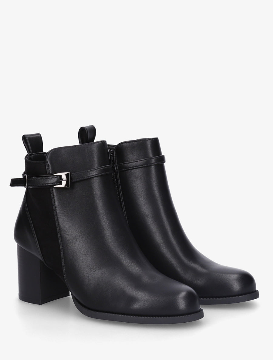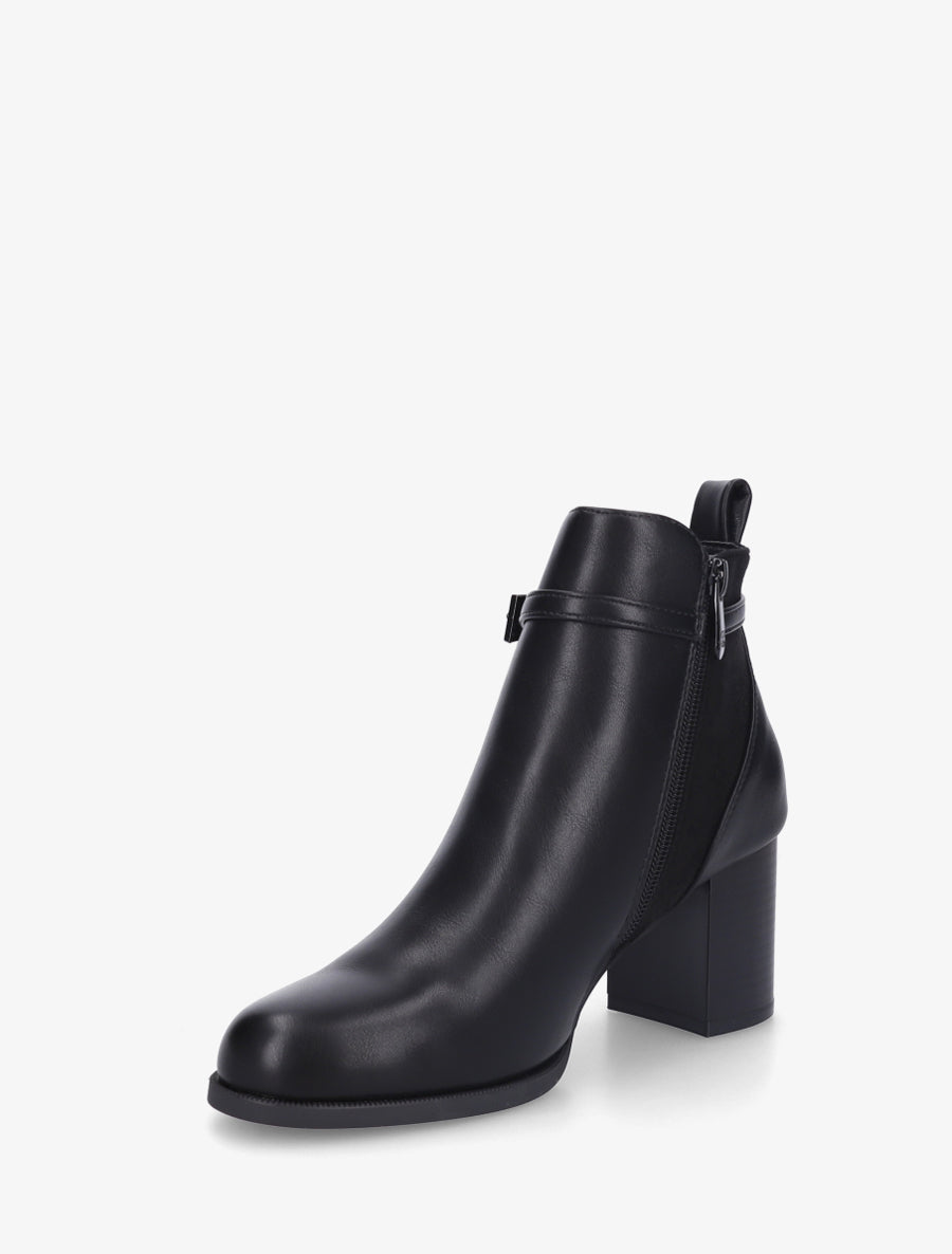 Ces bottines noires associent avec raffinement simili cuir et suédine pour un effet bi-matière sophistiqué. Leur talon bloc de 7 cm assure confort et stabilité tout au long de la journée. La tige de 13 cm galbe élégamment la cheville, sublimée par une sangle décorative tendance. Le zip intérieur facilite l'enfilage tandis que les bouts ronds apportent une touche intemporelle. Parfaites pour vos journées au bureau comme pour vos sorties urbaines, elles s'accordent aussi bien avec un jean qu'une robe midi.