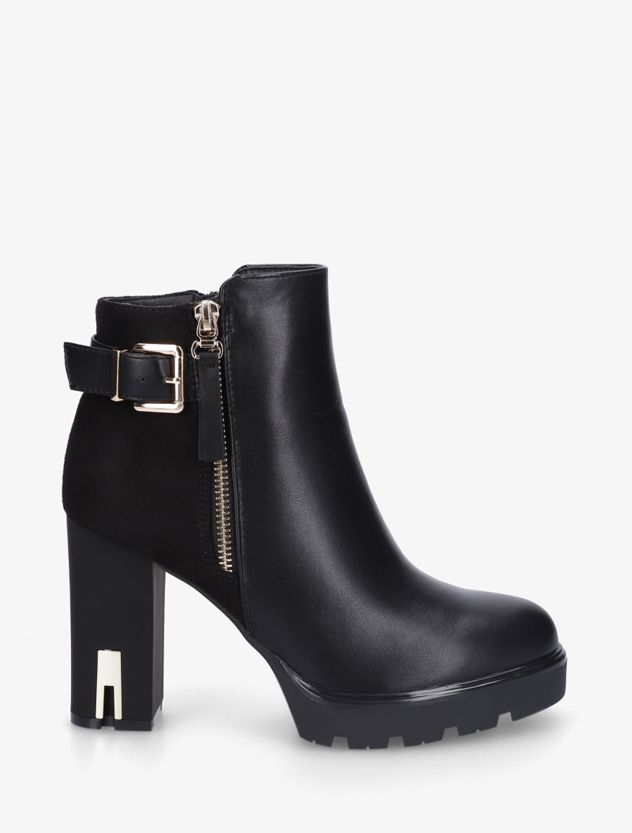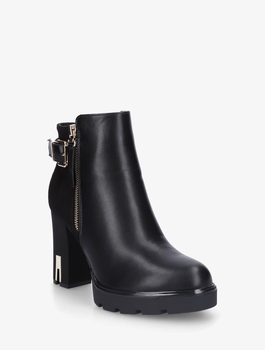 Ces bottines noires associent simili cuir et suédine pour un effet bi-matière moderne. Leur talon carré de 9,5 cm et leur semelle crantée assurent stabilité et confort. La tige de 9,5 cm est sublimée par une sangle à boucle décorative et un zip latéral contrastant. Leur fermeture zippée intérieure facilite l'enfilage, tandis que les bouts ronds apportent une touche intemporelle. Parfaites pour structurer vos looks urbains avec caractère et assurance.