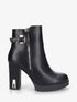 Ces bottines noires en simili cuir affirment un style audacieux avec leur talon bloc de 10 cm et leur semelle crantée. La tige de 13 cm galbe parfaitement la cheville, rehaussée par une sangle ajustable et un zip décoratif pour une touche moderne. Le détail métallique incrusté au talon apporte une finition raffinée. Leur fermeture zippée intérieure assure un enfilage pratique, tandis que les bouts ronds garantissent un confort optimal. Idéales pour dynamiser vos tenues urbaines avec caractère et assurance.