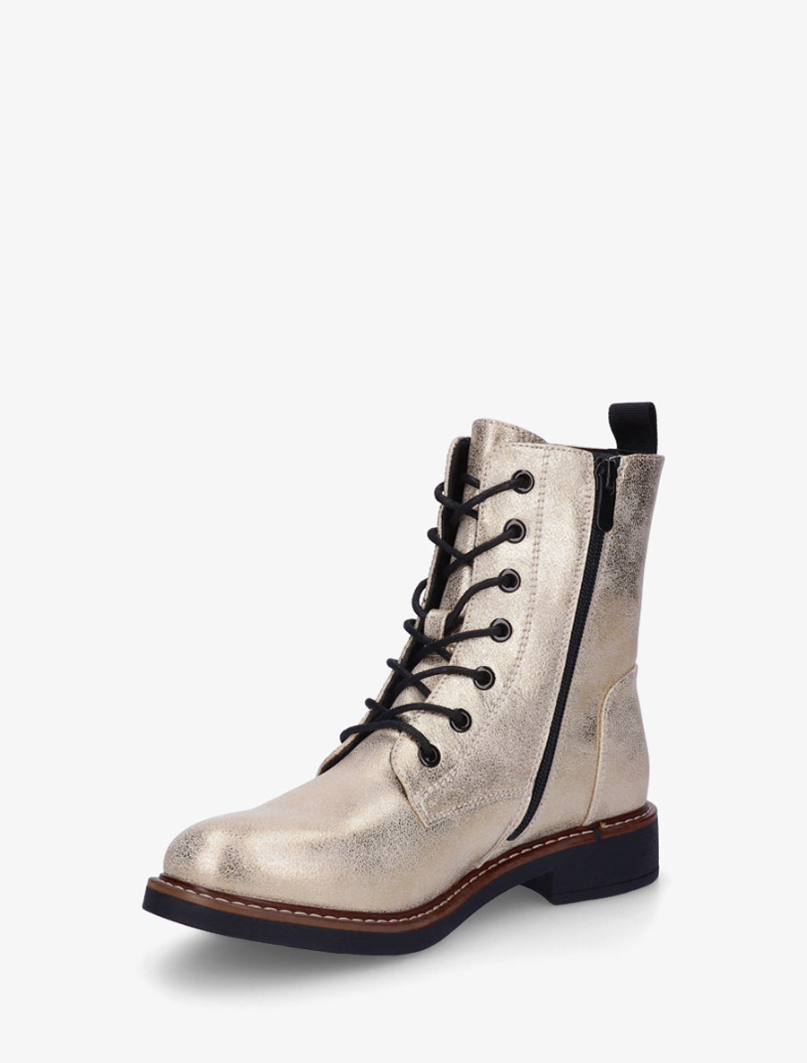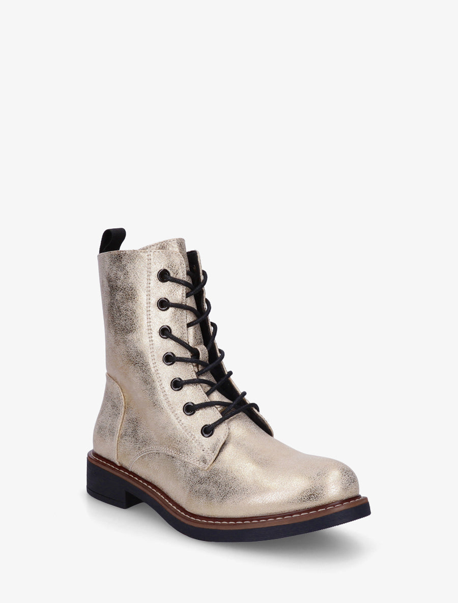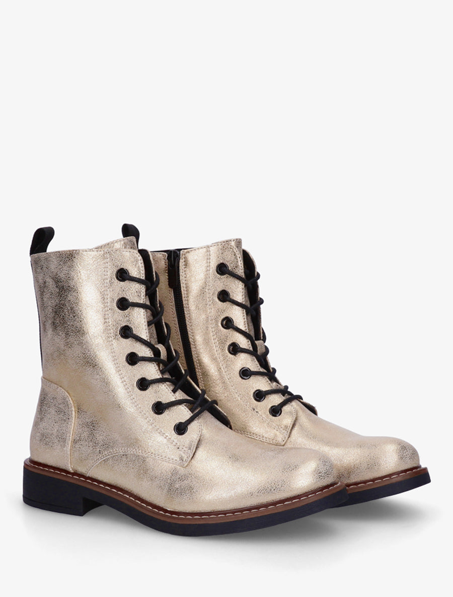 Ces bottines montantes en simili nacré apportent une touche lumineuse et sophistiquée à vos tenues. Dotées d'un talon bloc de 3 cm assurant confort et stabilité, elles affichent une tige de 15 cm rehaussée par un système de lacets tendance. La fermeture zippée intérieure au niveau de la cheville facilite l'enfilage, tandis que les bouts ronds offrent un style intemporel. Parfaites pour structurer un look urbain ou agrémenter une tenue décontractée, ces bottines dorées s'imposent comme un essentiel polyvalent de votre garde-robe.
