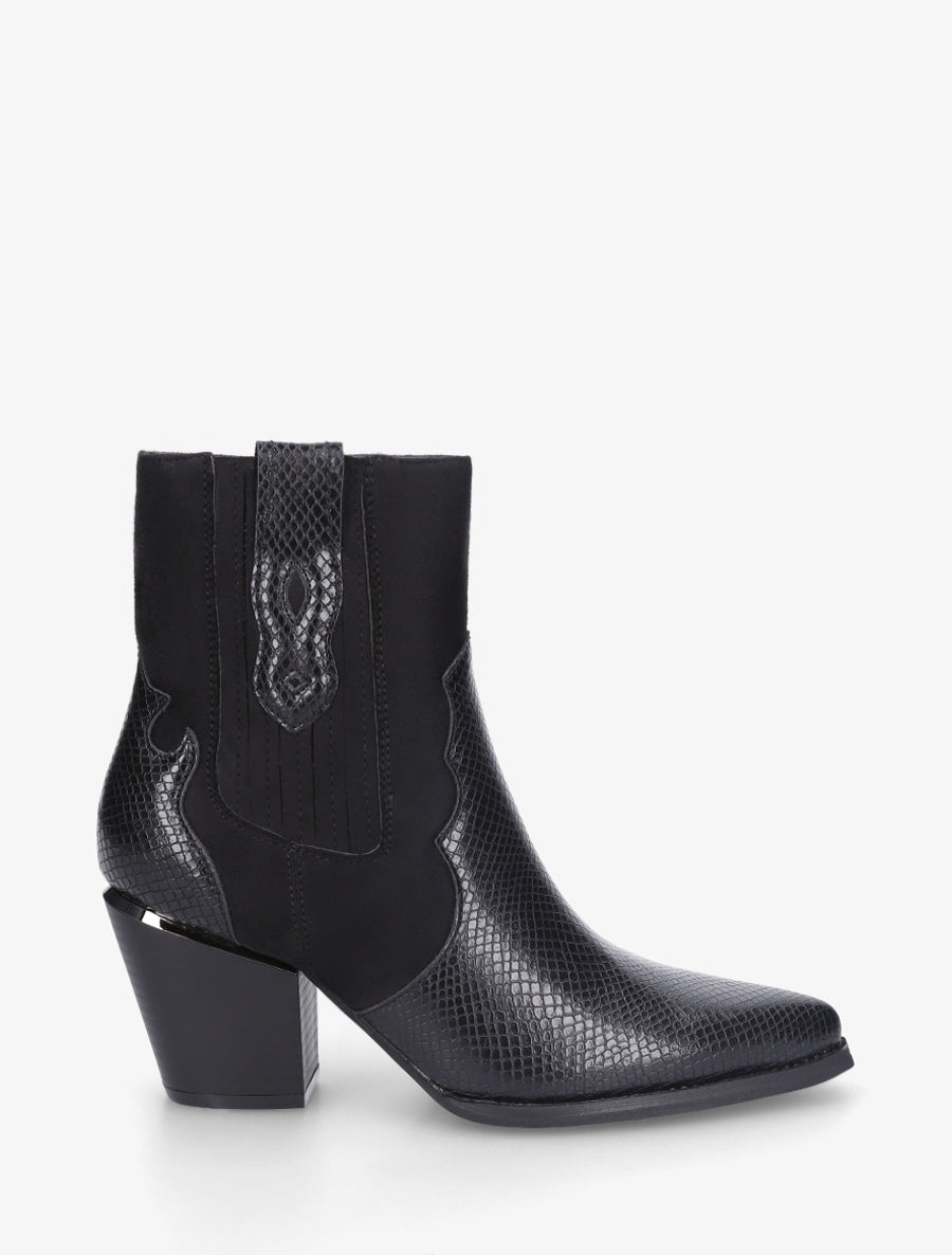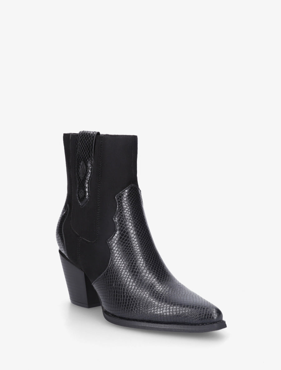 Adoptez l'esprit western avec ces bottines santiag au design affirmé. Leur silhouette en simili cuir et suédine se distingue par un bout pointu élégant et un talon bottier de 7,5 cm qui galbe la silhouette. Les empiècements effet python apportent une touche rock tandis que la cheville élastiquée garantit un enfilage facile grâce à la fermeture zip intérieure. Avec leur tige de 14 cm, ces bottines noires subliment tous vos looks urbains, du jean slim à la robe fluide. L'alliance parfaite entre caractère western et modernité pour affirmer votre style au quotidien.