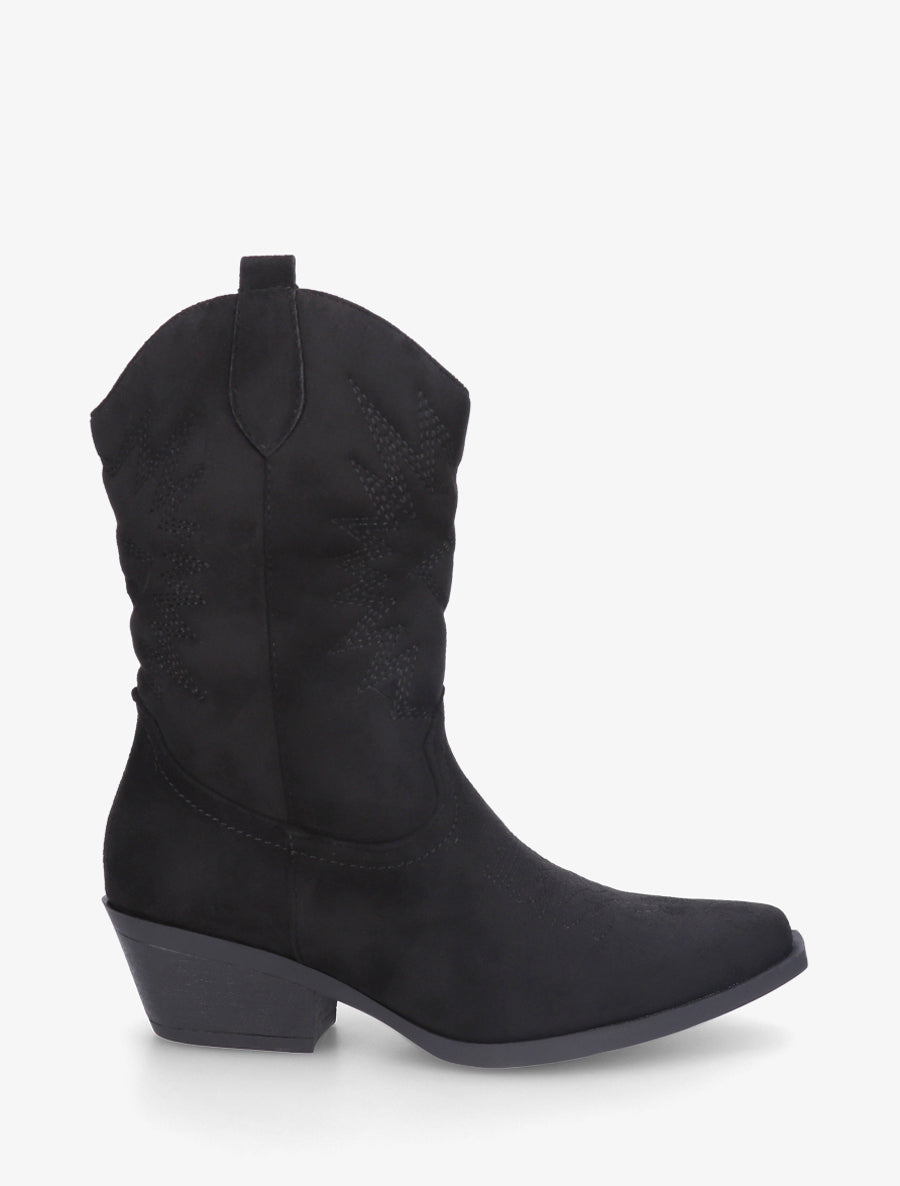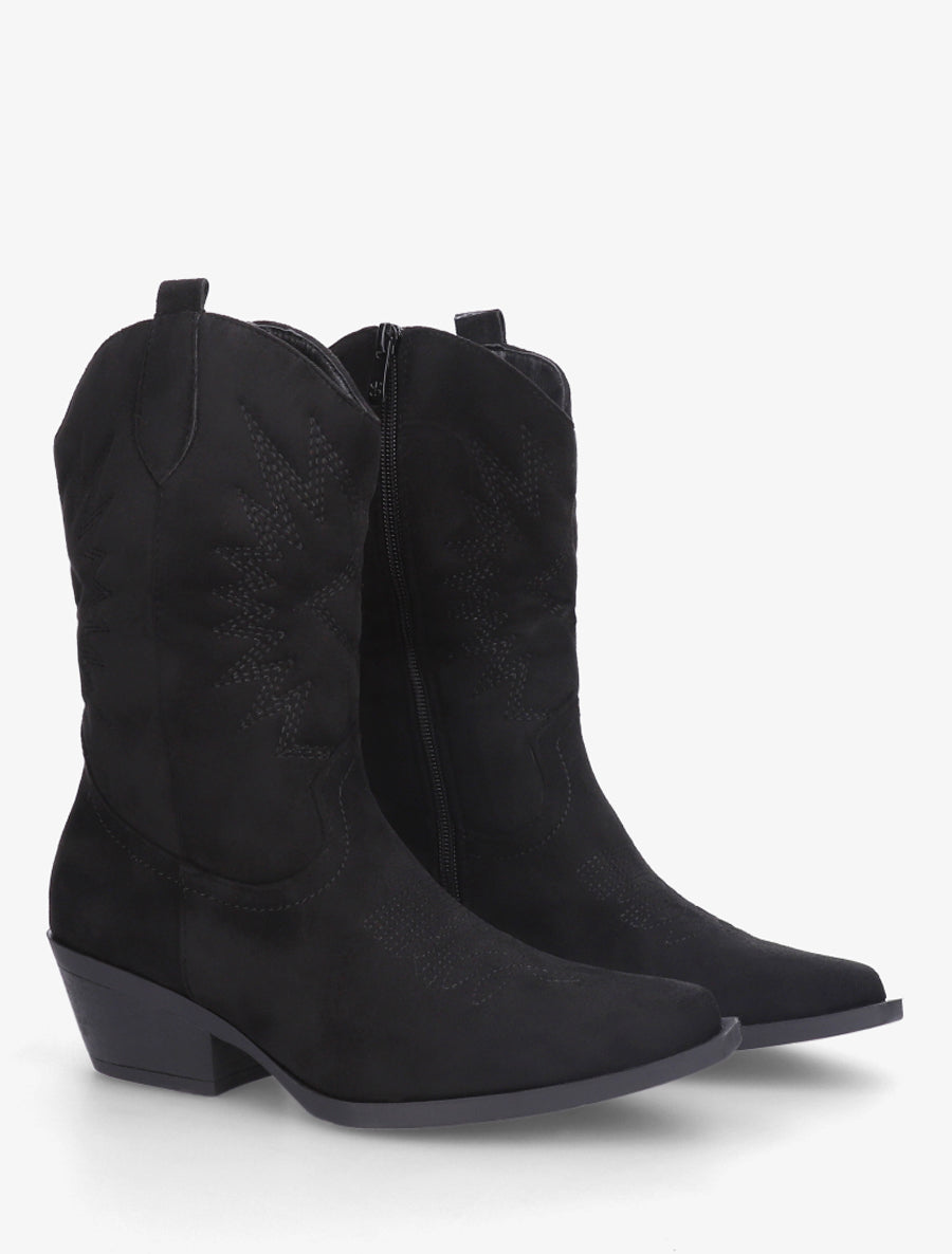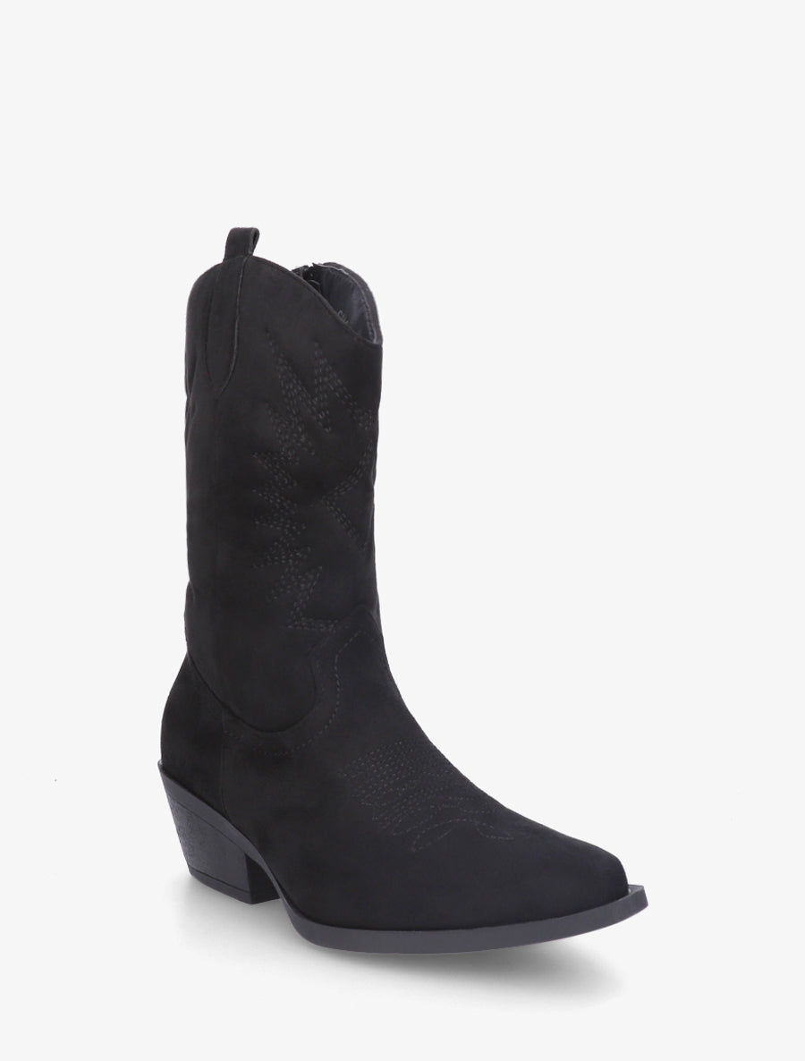 Ces bottines santiags en suédine noire incarnent l'esprit western revisité avec élégance. Leur tige de 18 cm et leur bout pointu sculptent la silhouette, tandis que le talon bottier de 5 cm apporte confort et maintien. Les surpiqûres authentiques soulignent le caractère cowboy de ces boots, complétées par une fermeture zip intérieur cheville pour un enfilage facile. Parfaites pour dynamiser un jean brut ou adoucir une robe fluide, elles s'imposent comme l'atout caractère de votre vestiaire automne-hiver.