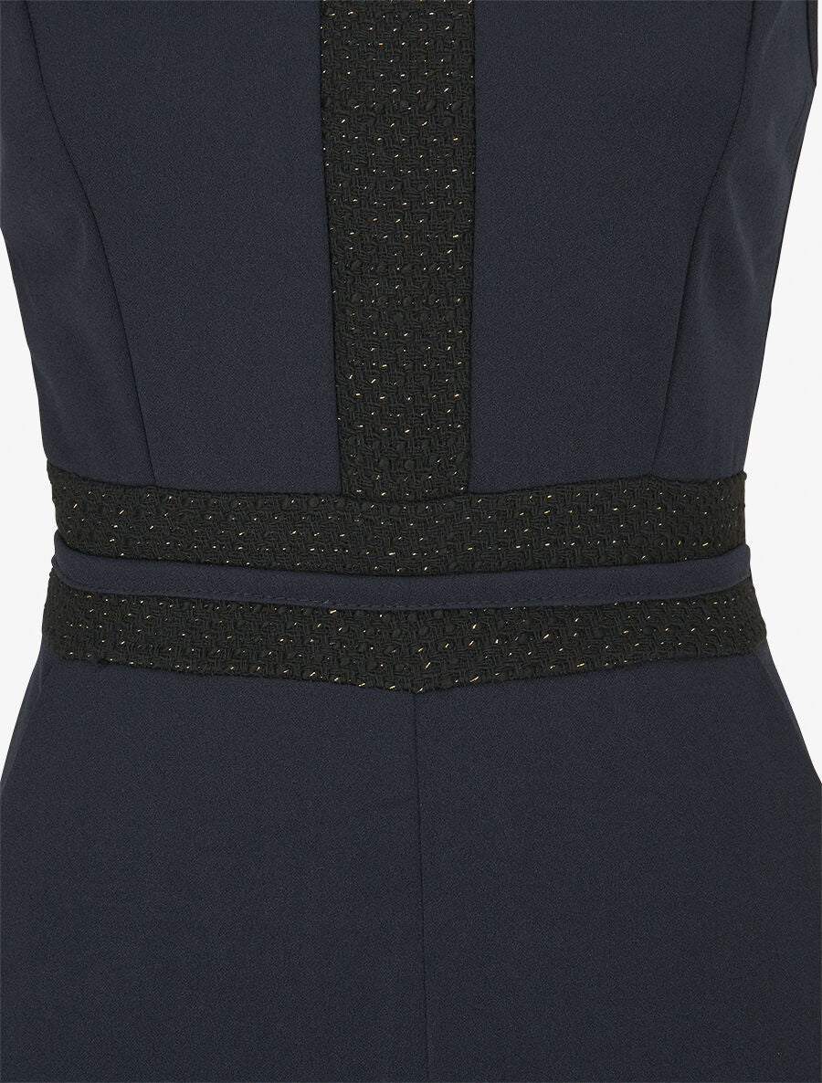 Découvrez cette combinaison marine fluide à la coupe droite élégante, sublimée par des bandes irisées qui apportent une touche moderne et lumineuse. Son encolure ronde et sa coupe sans manches offrent un style épuré parfait pour la saison estivale. Dotée de deux poches pratiques et d'une fermeture zippée au dos, elle allie confort et praticité. Confectionnée en Italie avec soin, cette pièce fluide vous accompagne avec style lors de vos sorties urbaines ou événements décontractés. Un essentiel mode aux finitions raffinées.