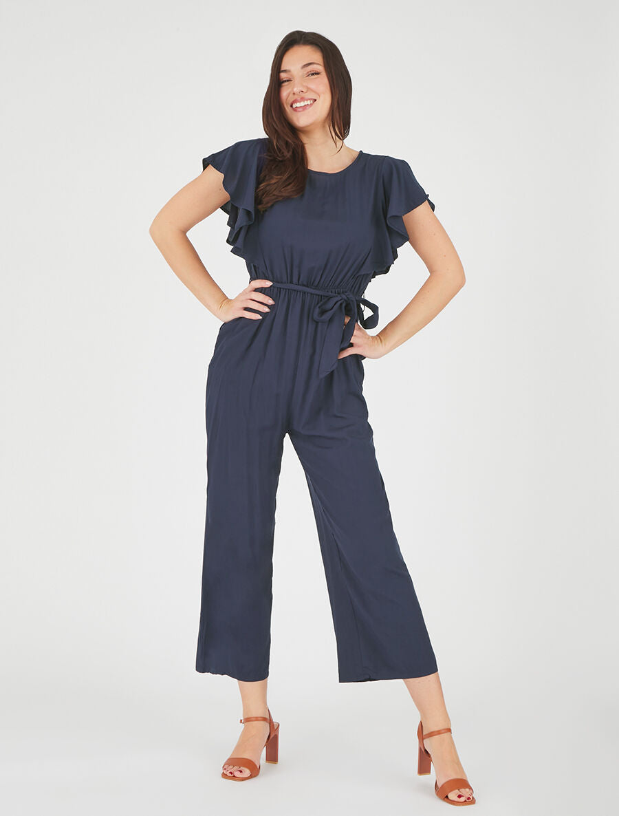 Découvrez cette combinaison marine en viscose fluide qui allie confort et féminité. Ses manches courtes volantées apportent une touche romantique, tandis que l'encolure ronde et la taille élastiquée garantissent un ajustement parfait. Dotée de deux poches pratiques et d'une ceinture à nouer pour marquer la silhouette, elle se ferme par zip au dos. Idéale pour vos sorties estivales ou vos journées au bureau, cette pièce polyvalente se porte aussi bien avec des sandales qu'avec des escarpins.