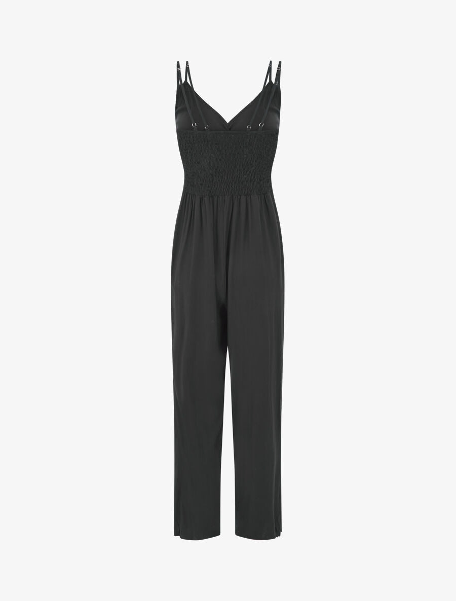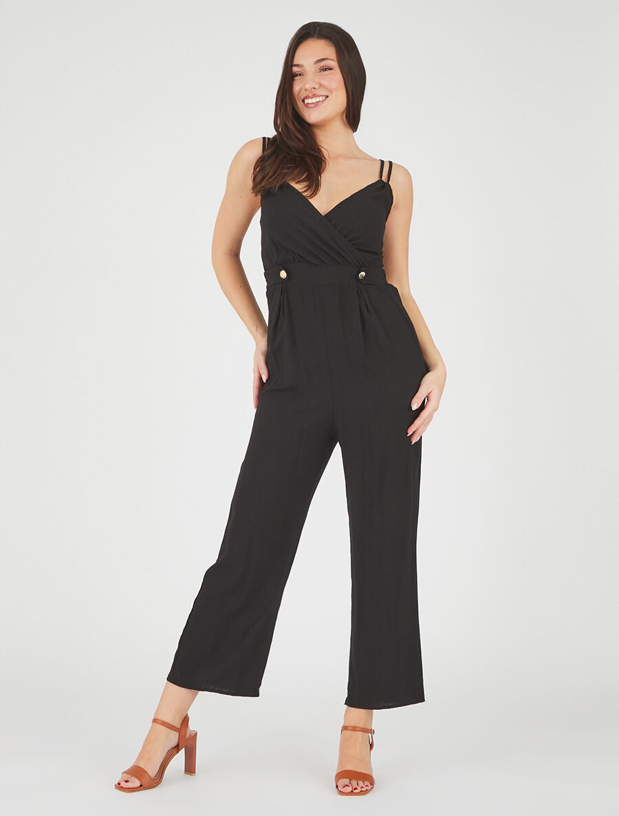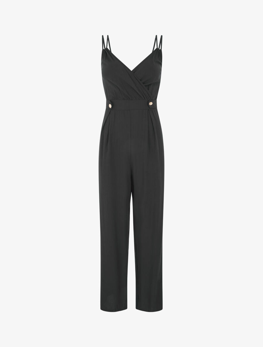 Adoptez l'élégance décontractée avec cette combinaison fluide noire au charme irrésistible. Son encolure cache-cœur sublimée par des boutons décoratifs apporte une touche raffinée, tandis que les bretelles ajustables et le dos élastiqué garantissent un confort optimal. Facile à enfiler, cette pièce en viscose légère se distingue par sa fluidité naturelle et sa coupe flatteuse. Parfaite pour vos sorties estivales ou vos événements décontractés, elle s'enfile en un instant et vous accompagne toute la journée avec style. Une création polyvalente qui marie confort et allure moderne.