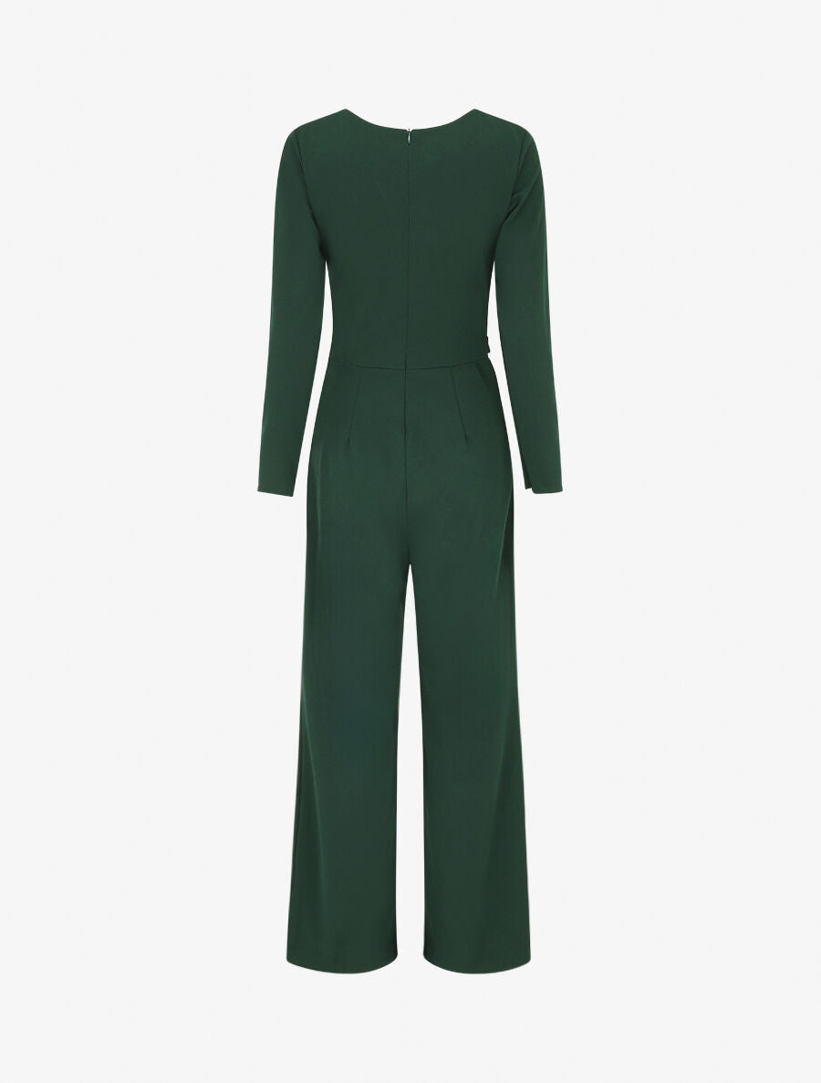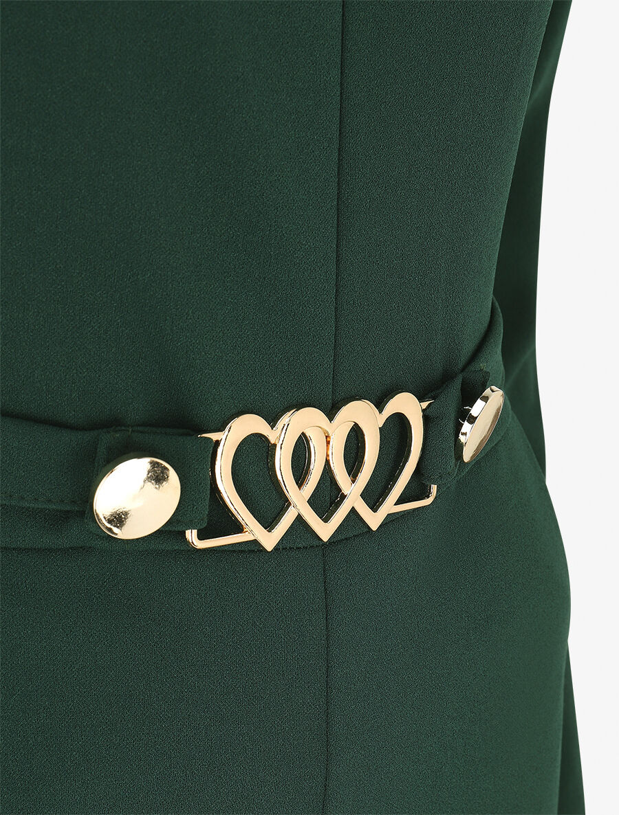 Découvrez cette combinaison vert sapin au charme audacieux. Sa coupe droite et son col rond plissé assurent un tombé impeccable, tandis que l'empiècement métal à motif cœurs apporte une touche raffinée et originale. Les manches longues et les deux poches fonctionnelles allient confort et praticité. La fermeture zippée au dos facilite l'enfilage. Confectionnée en Italie avec un tissu stretch, cette pièce offre une liberté de mouvement optimale pour toutes vos occasions.