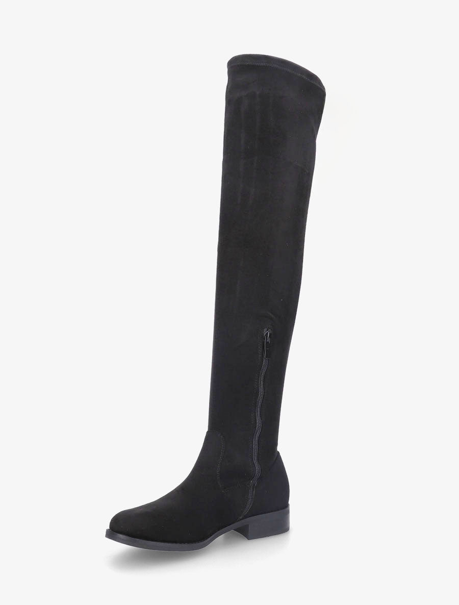 Ces cuissardes en suédine noire allient style audacieux et confort maîtrisé. Dotées d'une tige haute de 55 cm et d'un talon bloc de 3 cm, elles assurent une allure affirmée tout en préservant la stabilité. La fermeture zippée intérieure facilite l'enfilage, tandis que le cordon de serrage ajustable permet d'adapter parfaitement la cuissarde à votre morphologie. Avec leurs bouts ronds et leur tour de mollet de 28 cm, elles se portent aussi bien sur un jean slim qu'avec une robe courte pour un look résolument moderne et sophistiqué.