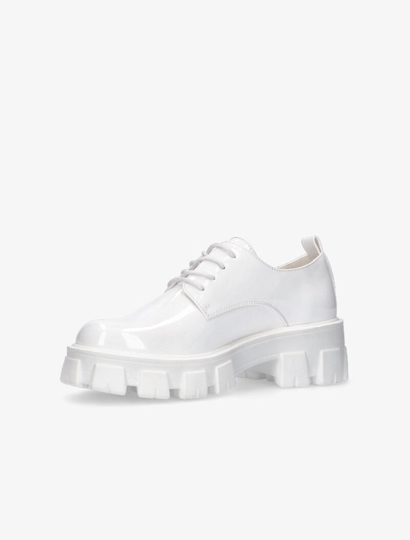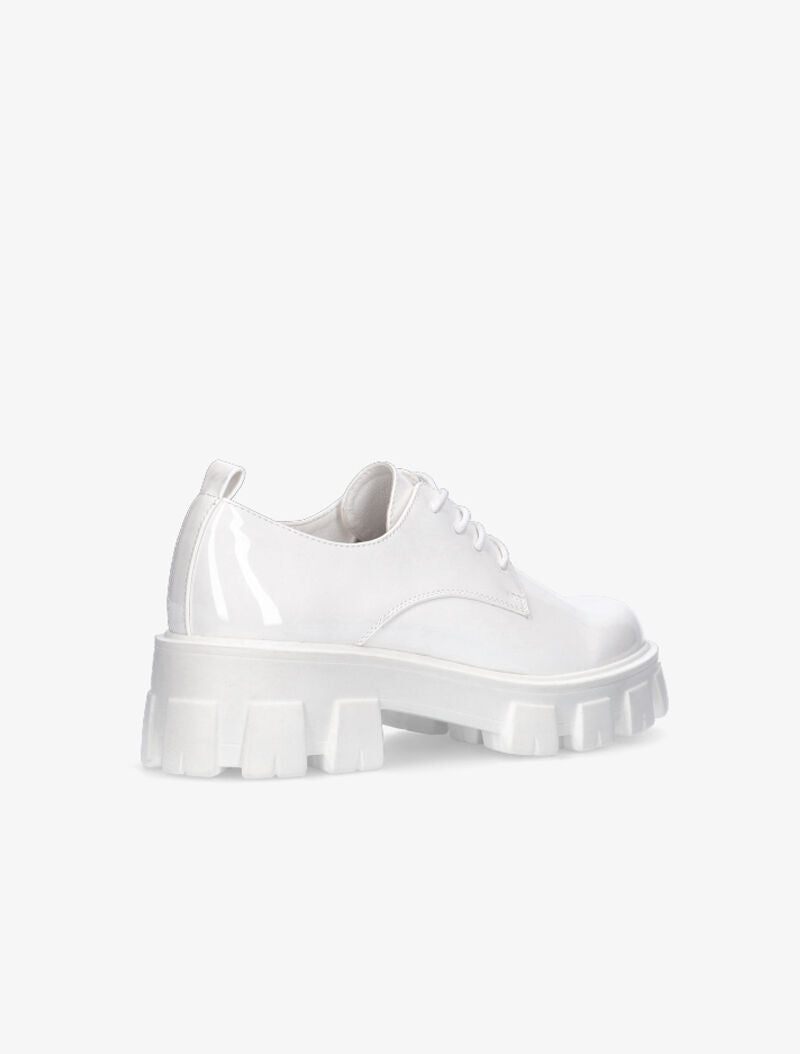 Ces derbies blanches en simili verni apportent une touche moderne et audacieuse à votre dressing. Leur semelle à gros crans offre une adhérence optimale tout en créant un look résolument contemporain. Le talon bloc de 5 cm assure confort et stabilité pour vos journées actives. Les bouts ronds et le système de laçage garantissent un ajustement parfait. Leur finition vernie lumineuse sublime la teinte blanche immaculée. Parfaites pour dynamiser un jean brut ou adoucir une robe fluide, ces chaussures polyvalentes s'adaptent à toutes vos envies de style urbain et affirmé.