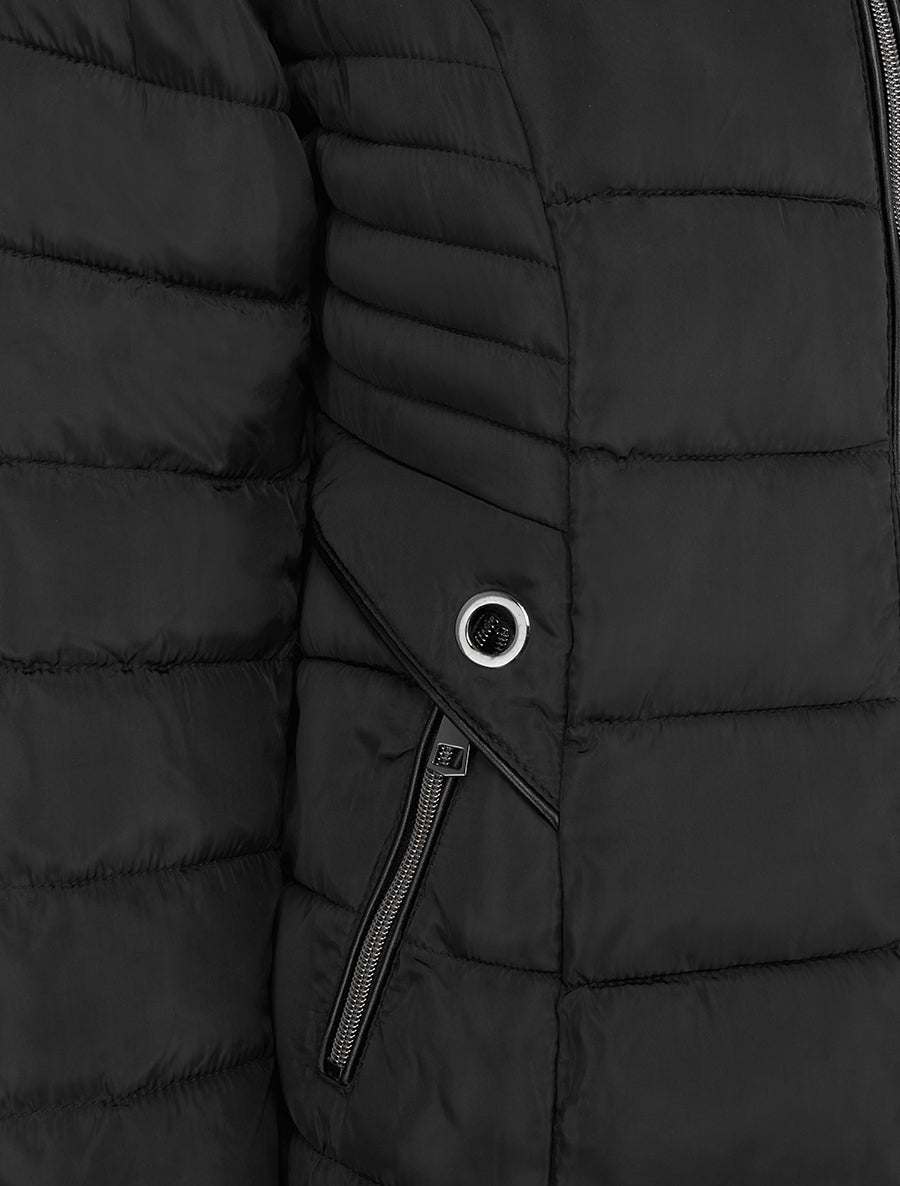 Cette doudoune matelassée noire allie chaleur et modernité avec sa coupe droite sophistiquée. Sa capuche amovible ornée de fourrure synthétique et son col montant assurent une protection optimale contre le froid. Les manches longues sont dotées de poignets anti-froid et d'un médaillon distinctif. Deux poches zippées fantaisies complètent ce modèle pratique, fermé par une fermeture zippée centrale. Parfaite pour affronter l'hiver luxembourgeois avec style, cette doudoune doublée vous accompagne au quotidien comme lors de vos escapades urbaines. Un incontournable de la saison froide.