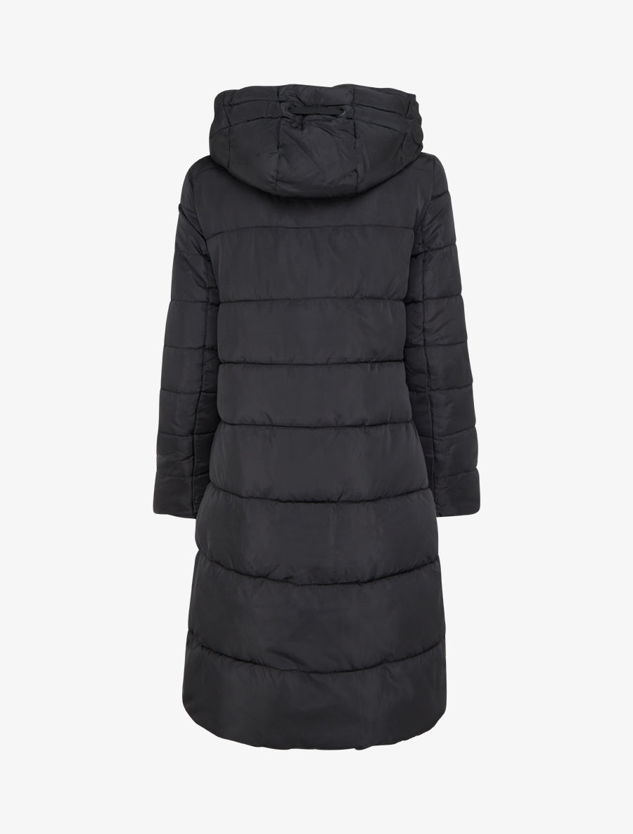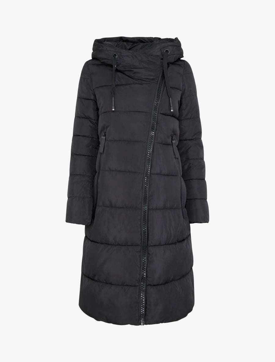 Doudoune longue à capuche et zip en biais - Noir - 1
