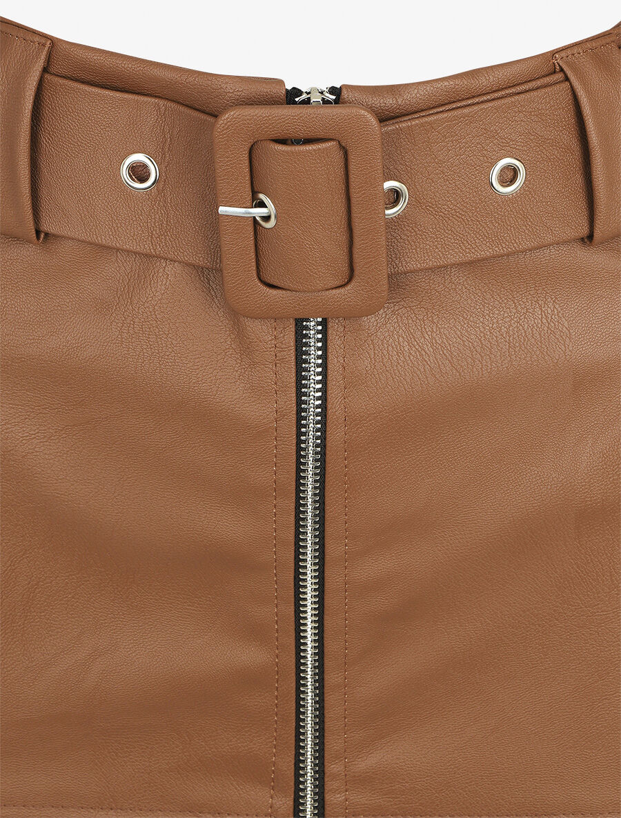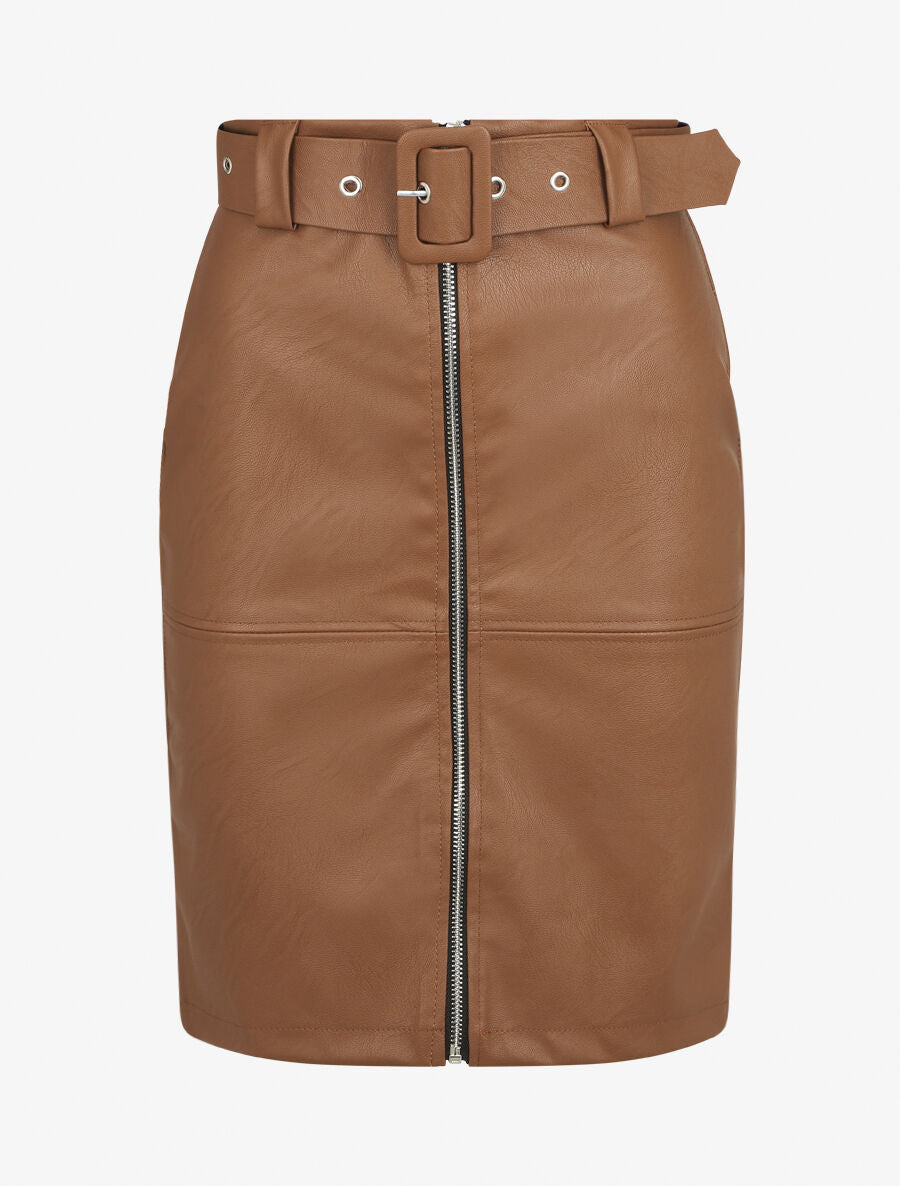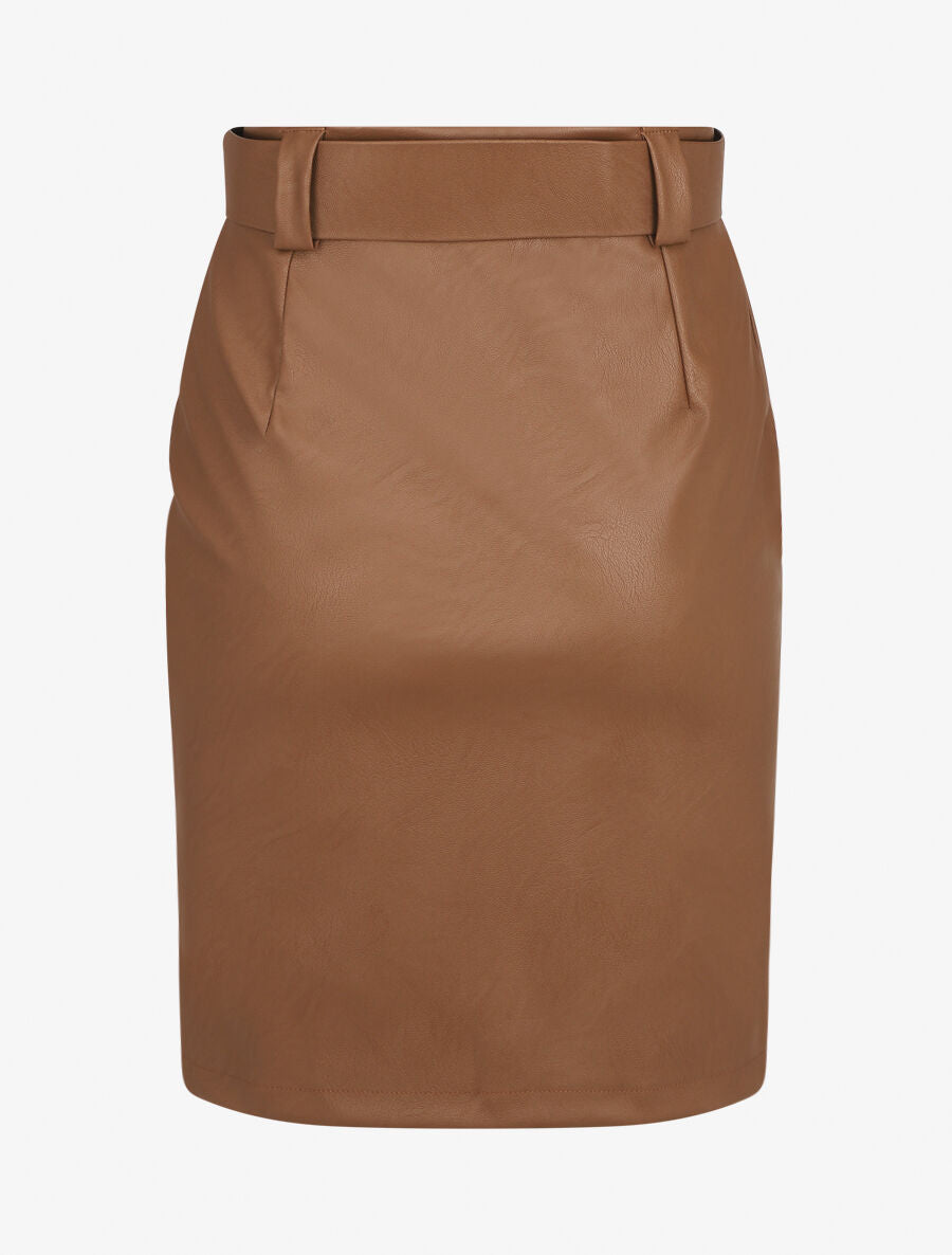 Jupe simili ajustée avec ceinture - Marron