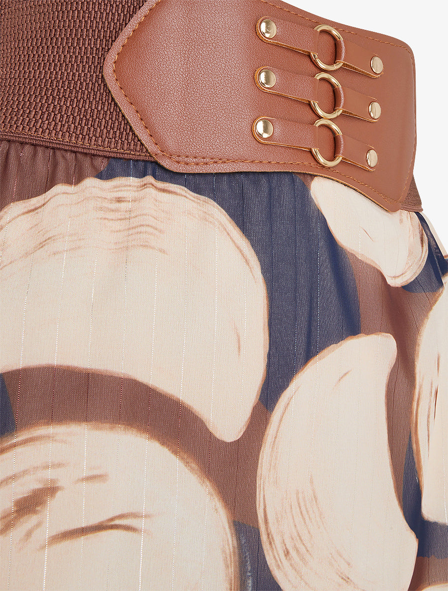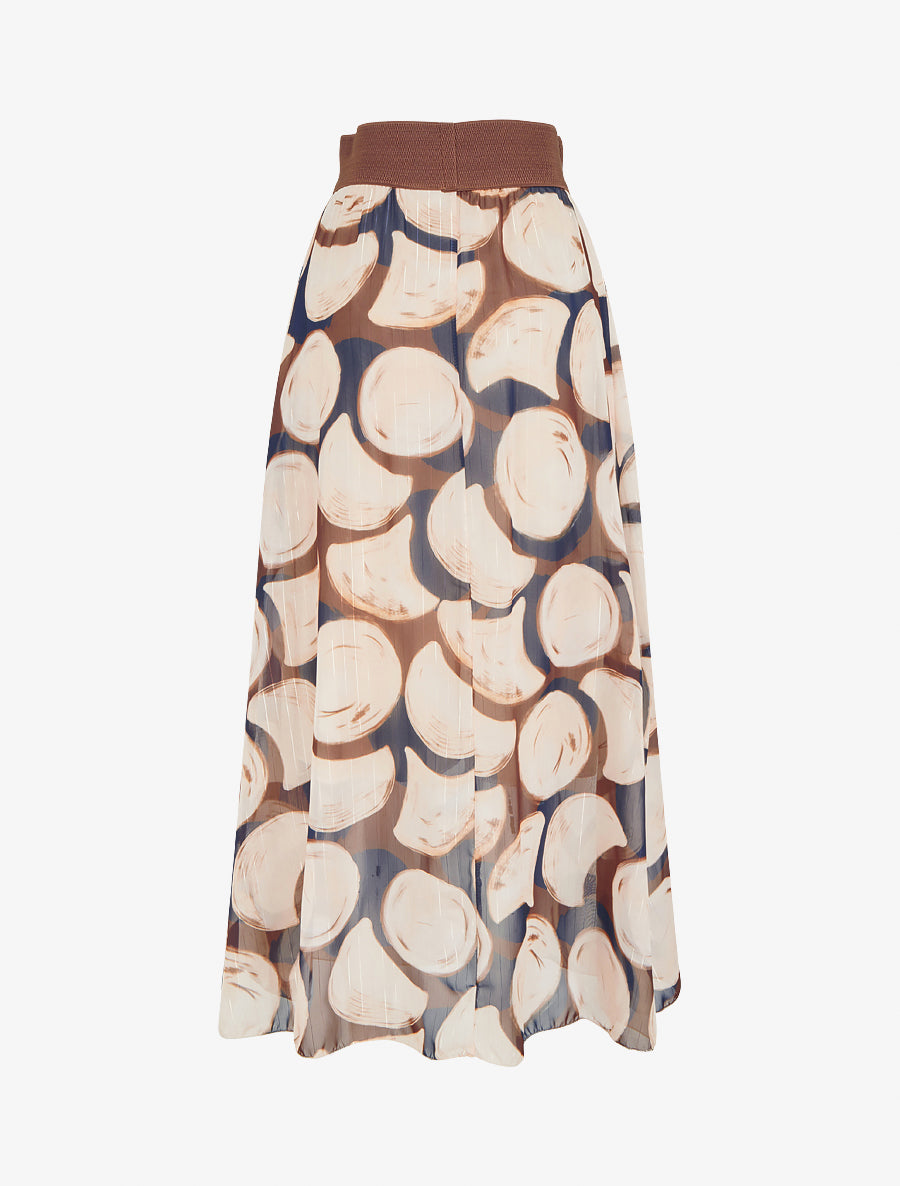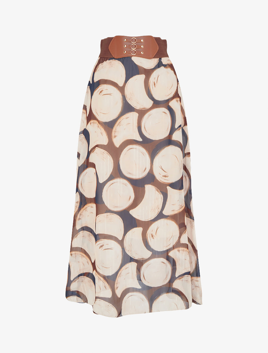 Cette jupe longue marine revisite l'élégance avec son imprimé cercles fantaisie et ses liserés irisés qui captent la lumière. Sa taille haute élastiquée style corset sculpte la silhouette avec raffinement, tandis que sa coupe évasée offre une fluidité parfaite. Entièrement doublée pour un confort optimal, cette pièce fabriquée en Italie se distingue par sa finition soignée. Idéale pour vos occasions spéciales comme pour sublimer votre quotidien, elle s'associe aussi bien à un chemisier classique qu'à un top moderne. Une création qui allie savoir-faire italien et modernité.