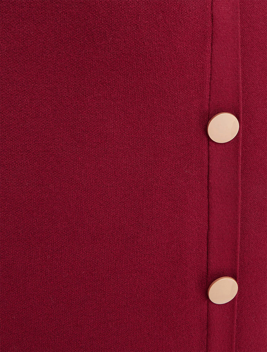 Découvrez cette jupe en maille bordeaux qui revisite le vestiaire féminin avec audace. Sa coupe droite à taille haute affine la silhouette, tandis que son bas asymétrique apporte une touche contemporaine irrésistible. Les boutons décoratifs ajoutent un détail raffiné à cette pièce facile à enfiler. Confectionnée dans un mélange de viscose, polyester et polyamide, cette jupe taille unique offre confort et style pour toutes vos occasions. Une création qui s'impose comme l'alliée mode de votre garde-robe automnale et hivernale.