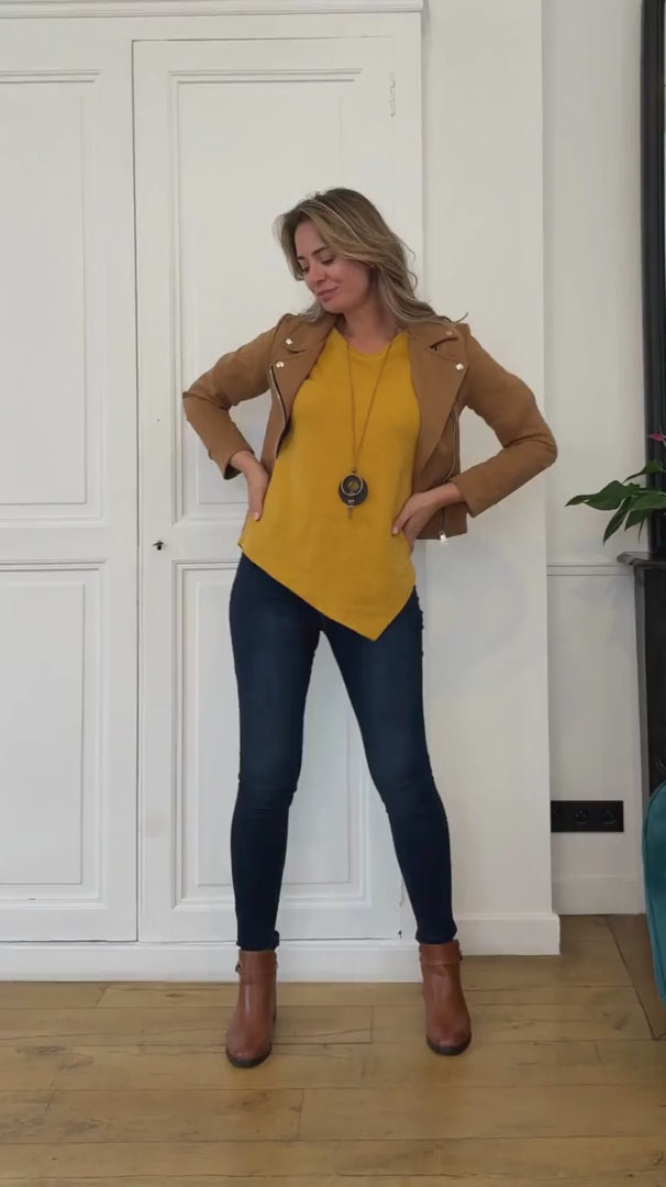 Pull asymétrique col rond retroussable - Jaune moutarde