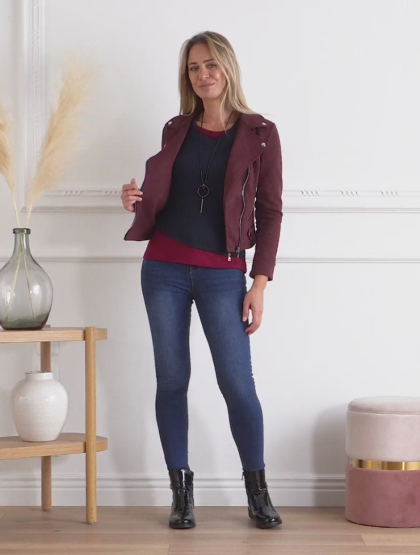 Veste suédine col cranté et poches zippées - Prune