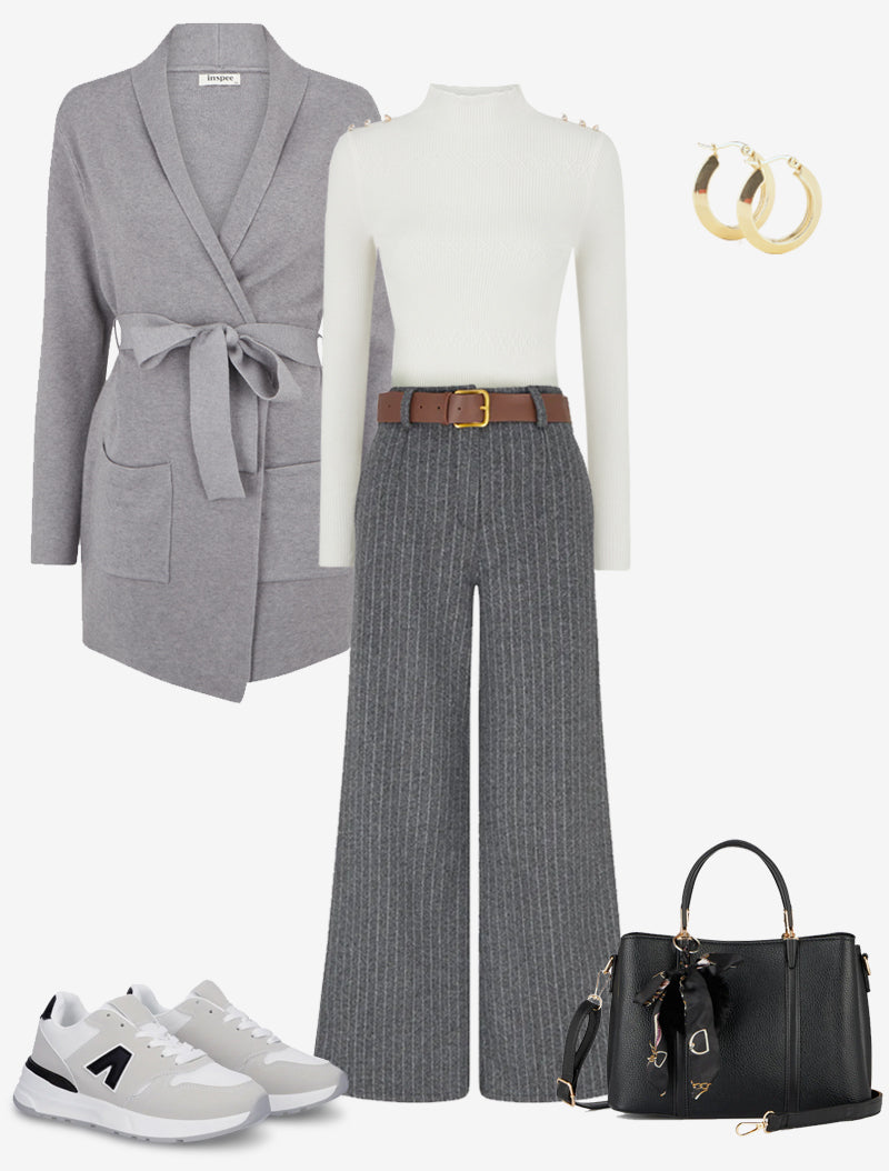 Pantalon rayé taille haute ceinturée - Gris foncé