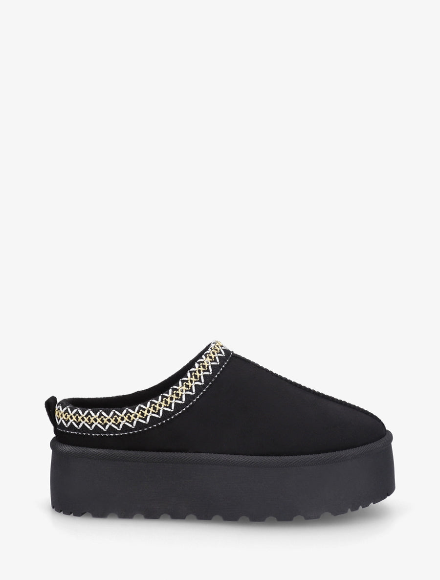 Adoptez le confort raffiné avec ces mules en suédine noire ornées de broderies délicates sur les bords. Leur semelle plateforme de 5 cm assure une hauteur élégante tout en garantissant une stabilité optimale. L'intérieur fourré procure une sensation douillette à chaque pas, tandis que les bouts ronds offrent un ajustement confortable. Faciles à enfiler, ces mules allient praticité et style pour vos moments de détente comme vos sorties décontractées. Un modèle polyvalent qui sublime votre garde-robe avec une touche artisanale distinctive.
