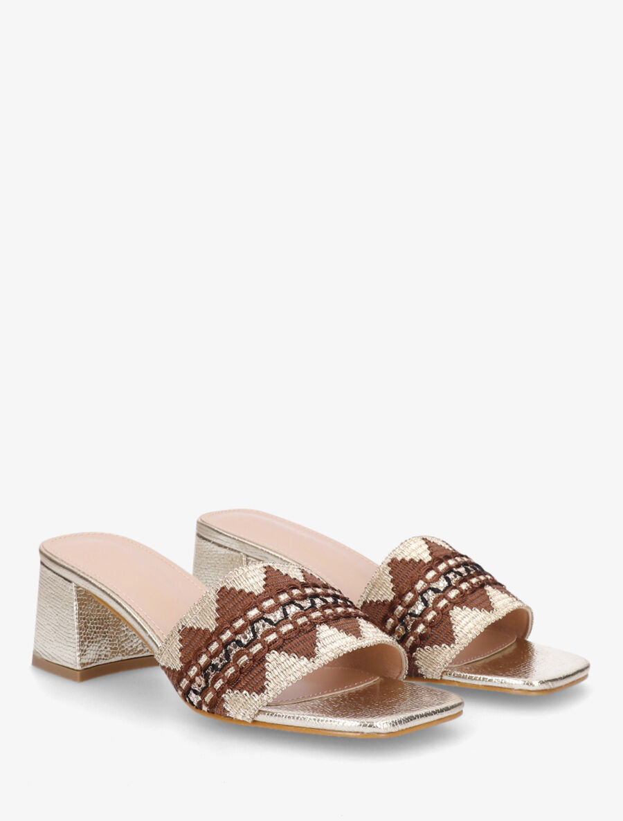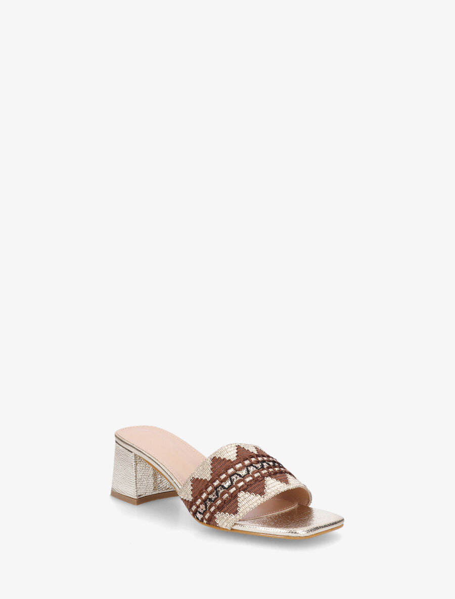 Ces mules dorées en tissu jacquard et simili nacré affichent un motif zigzag irisé pour un style unique et moderne. Leur talon carré de 6 cm assure confort et élégance au quotidien. La bride jacquard graphique et les bouts ouverts apportent une touche contemporaine à cette chaussure facile à enfiler. Le mélange de matières nacrées et du tissage jacquard crée des reflets lumineux qui subliment la teinte dorée. Parfaites pour vos sorties estivales ou vos journées ensoleillées, ces mules se glissent aisément au pied pour un look sophistiqué sans effort.