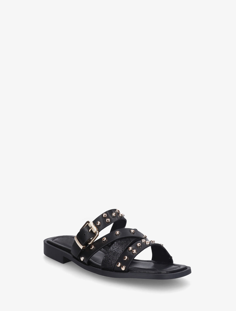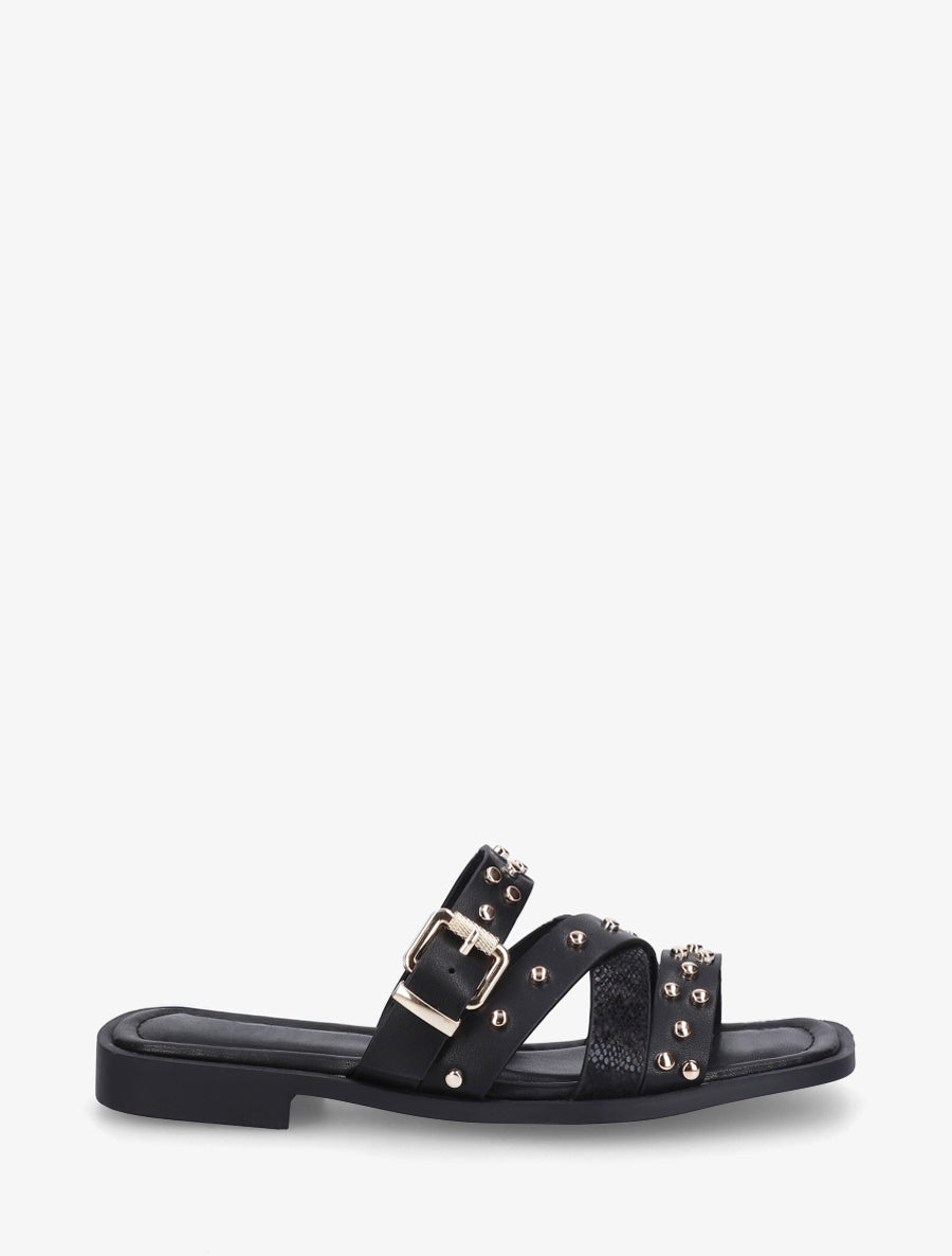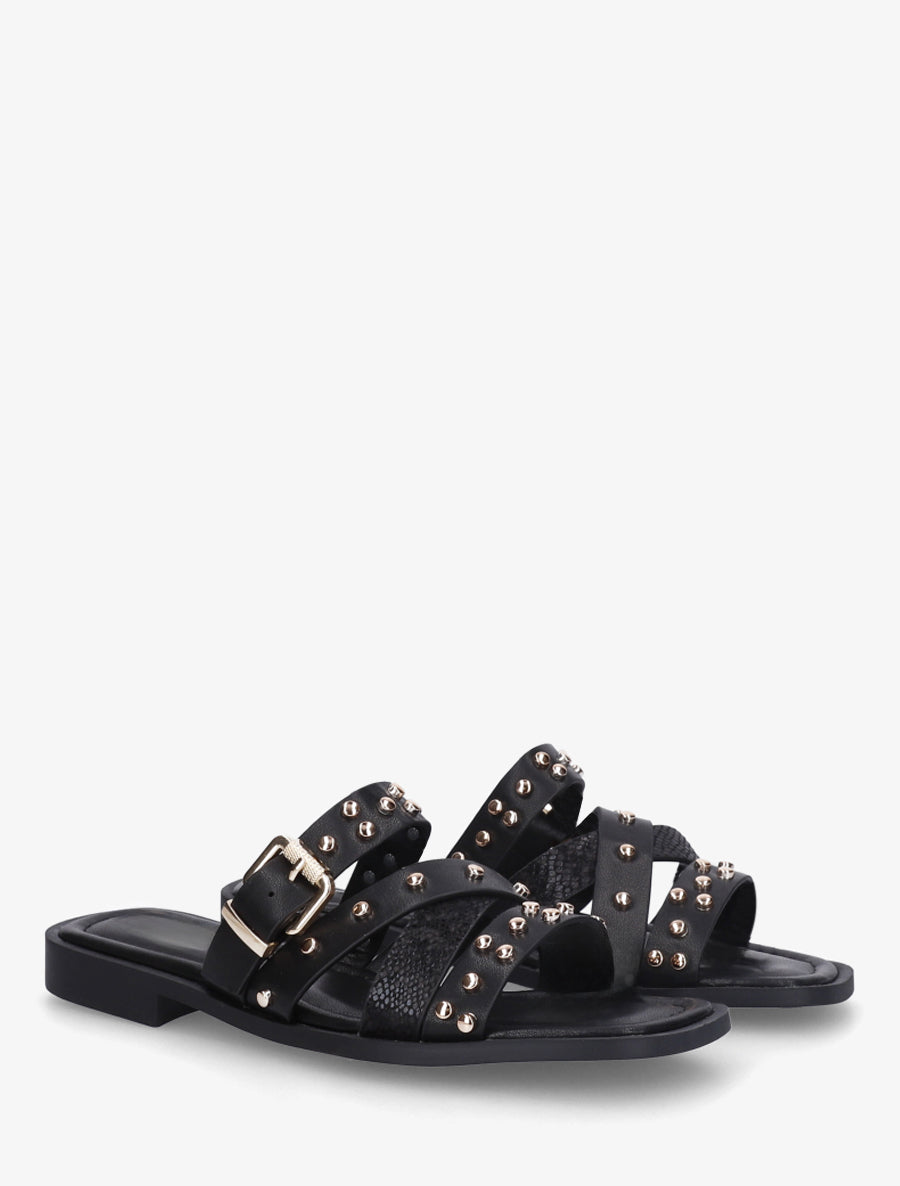 Adoptez un style audacieux avec ces mules plates noires qui allient confort et caractère. Confectionnées en simili cuir de qualité, elles se distinguent par leurs brides ornées de clous argentés et d'un imprimé reptile irisé du plus bel effet. La semelle chiquet de 2 cm assure une stabilité optimale tout en apportant une touche moderne. Leur design à enfiler et bouts ouverts garantit une praticité au quotidien. Parfaites pour sublimer vos tenues estivales ou apporter une note rock à vos looks urbains, ces mules deviendront rapidement vos alliées mode incontournables.
