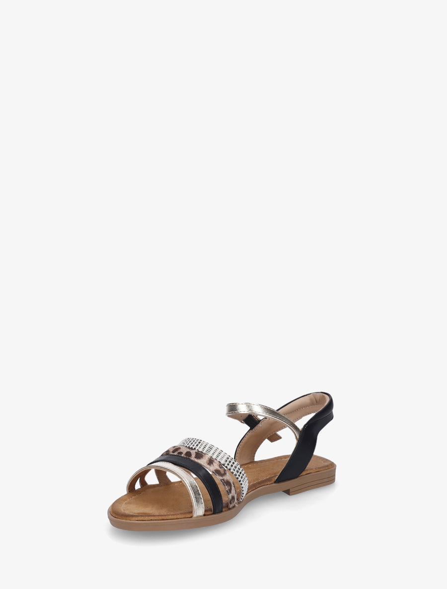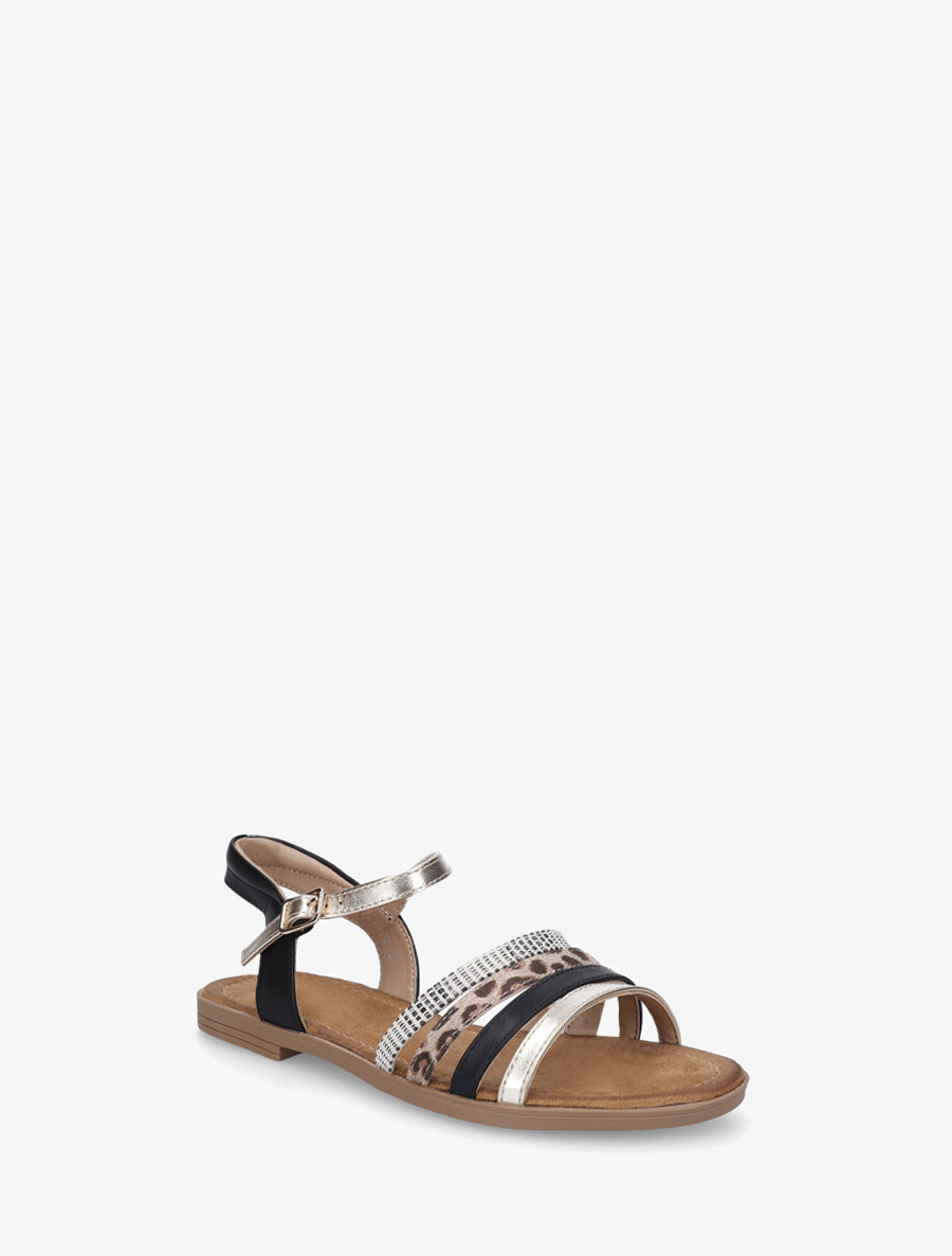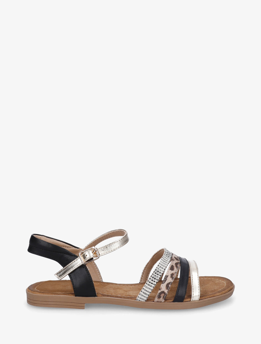 Ces sandales plates en simili cuir noir se distinguent par leurs brides à imprimé dépareillé pour un style audacieux et original. La semelle chiquet de 1,5 cm assure un confort optimal tout au long de la journée. Le tour de cheville nacré avec bride à boucle ajustable garantit un maintien parfait, tandis que les bouts ouverts apportent légèreté et fraîcheur. Idéales pour vos sorties estivales, elles ajoutent une touche de caractère à vos tenues décontractées comme à vos ensembles plus sophistiqués.