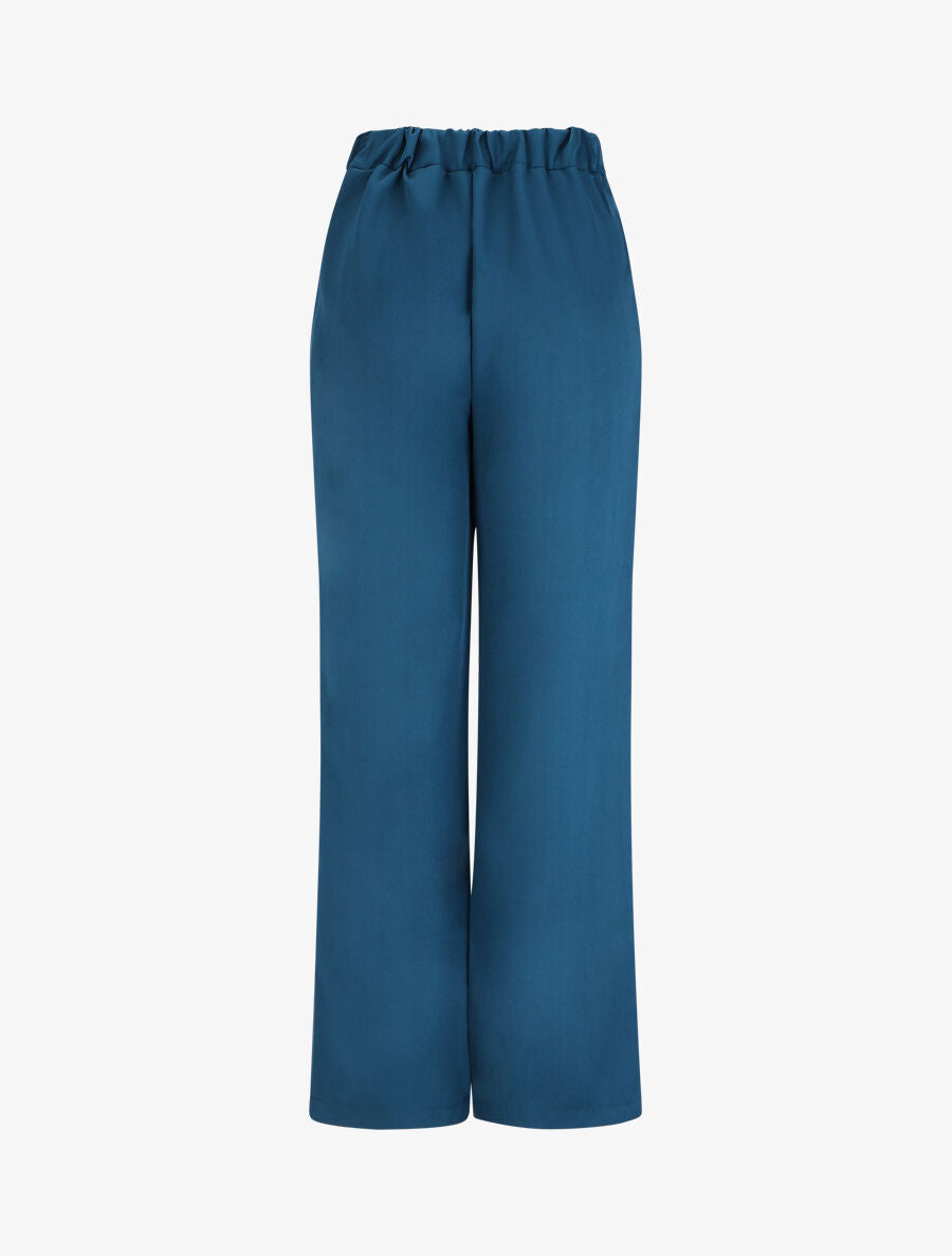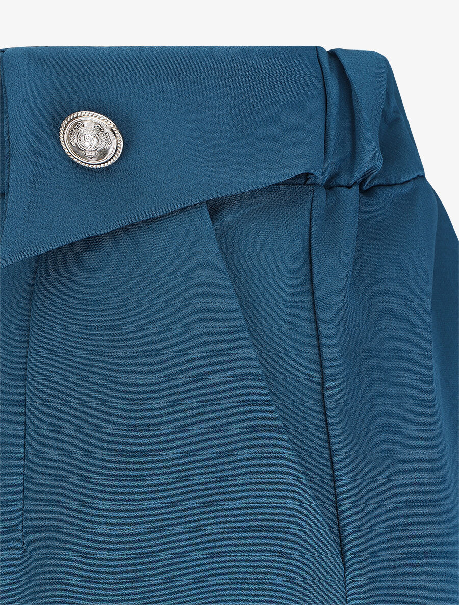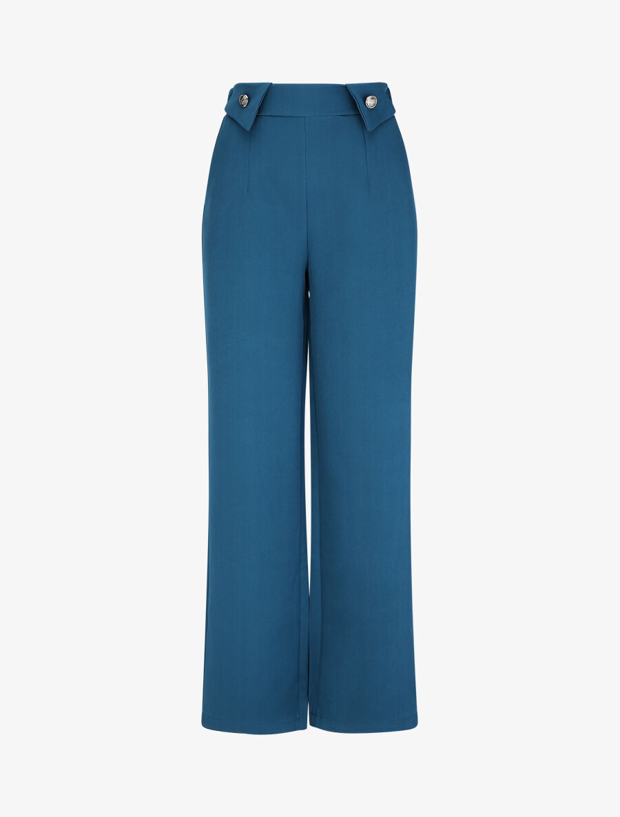 Ce pantalon droit taille haute en bleu canard apporte une touche d'élégance moderne à votre garde-robe. Sa taille haute élastiquée est sublimée par des empiècements et des boutons décoratifs raffinés. La coupe droite flatteuse assure un confort optimal tout au long de la journée. Doté de deux poches pratiques et d'un système à enfiler, ce modèle fabriqué en Italie allie fonctionnalité et style. Sa composition en polyester avec élasthanne garantit un maintien parfait et une liberté de mouvement appréciable. Idéal pour vos journées au bureau comme pour vos sorties décontractées.