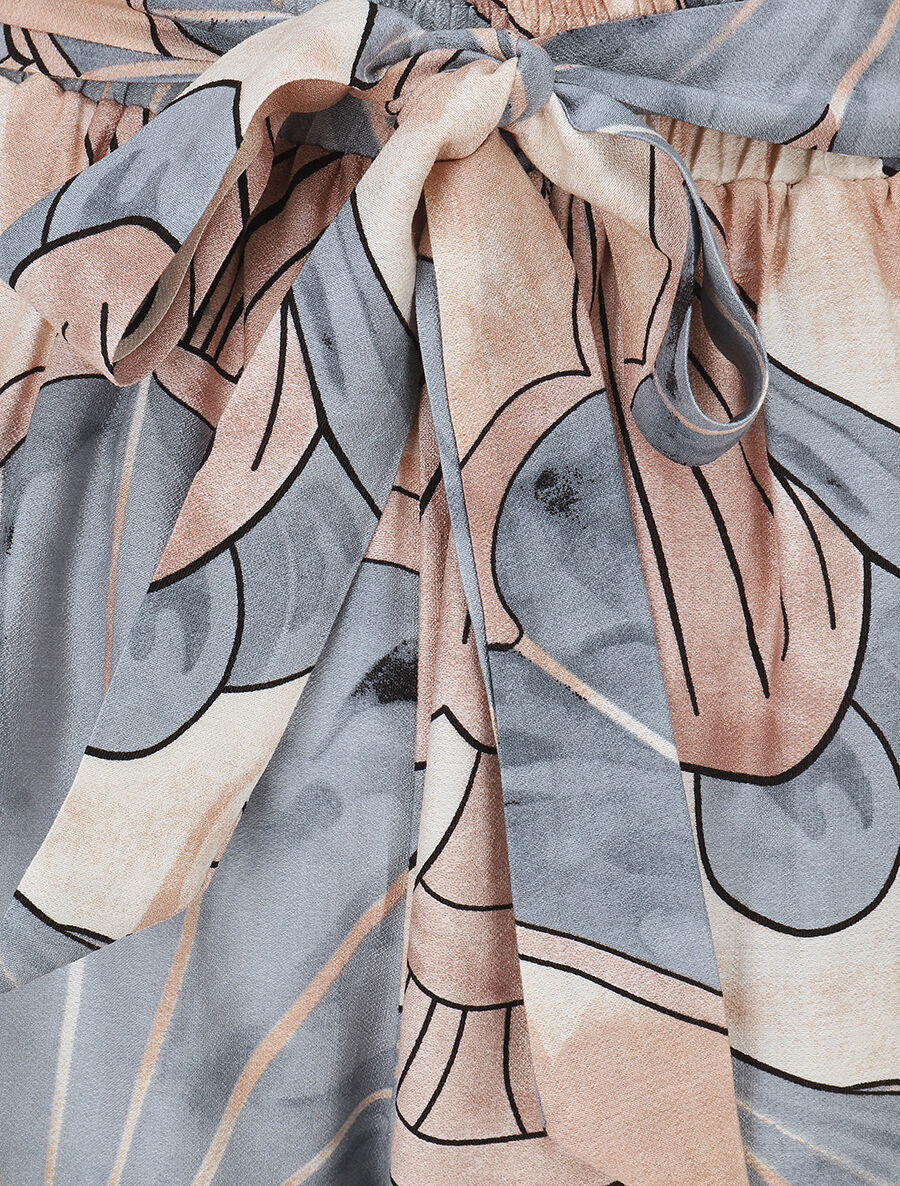 Adoptez l'élégance fluide de ce pantalon gris orné d'un imprimé éventails raffiné. Sa coupe droite flatteuse et sa taille haute élastiquée garantissent un confort optimal tout au long de la journée. Deux poches pratiques et une ceinture à nouer apportent une touche fonctionnelle et stylée. Facile à enfiler, ce modèle en viscose légère se porte aussi bien au bureau qu'en soirée. Un indispensable polyvalent qui sublime votre silhouette avec modernité et fluidité.