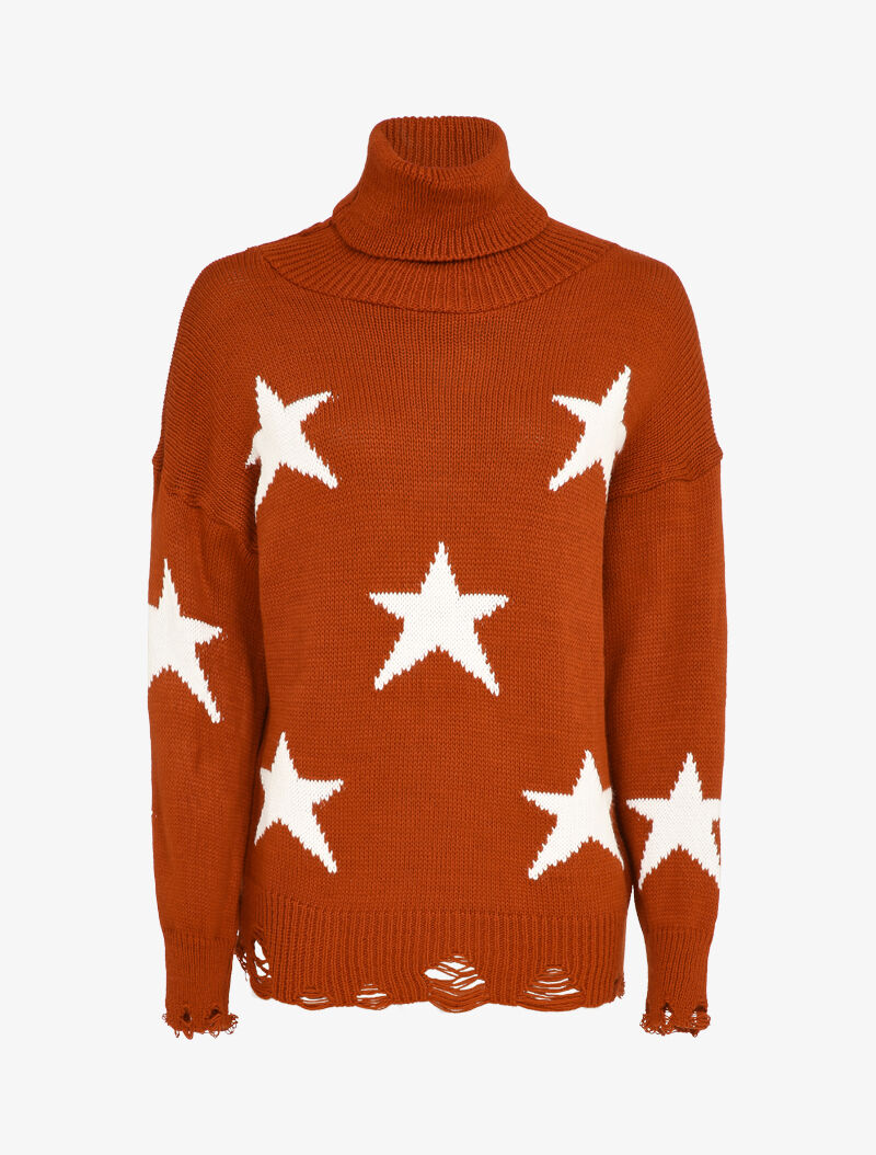 Pull à col roulé à bords effilochés et imprimé étoiles - Rouille - 1