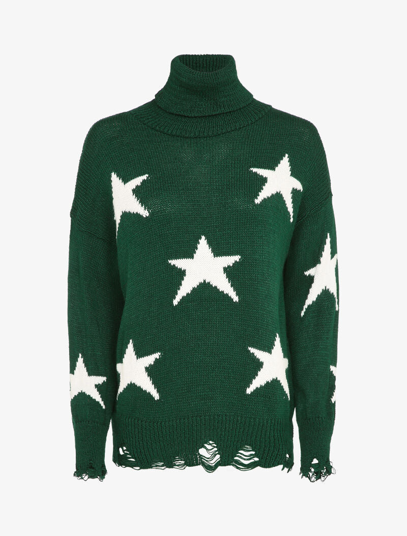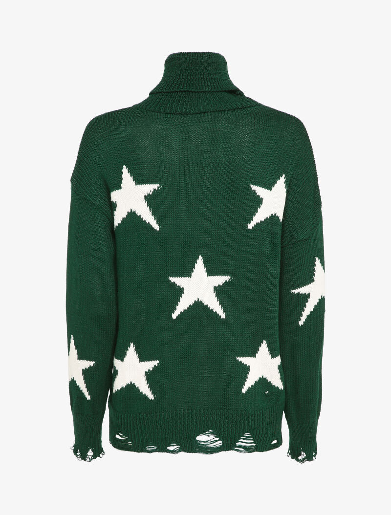 Pull à col roulé à bords effilochés et imprimé étoiles - Vert sapin - 1