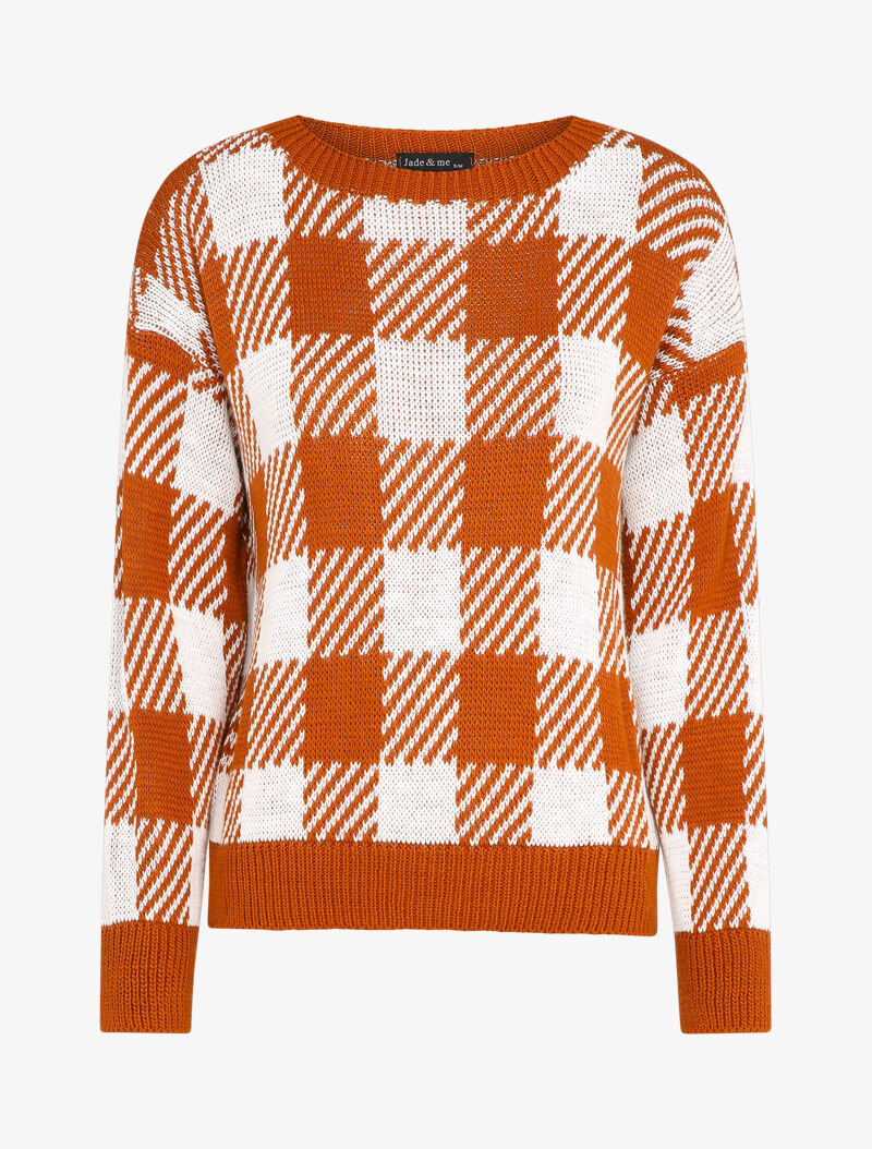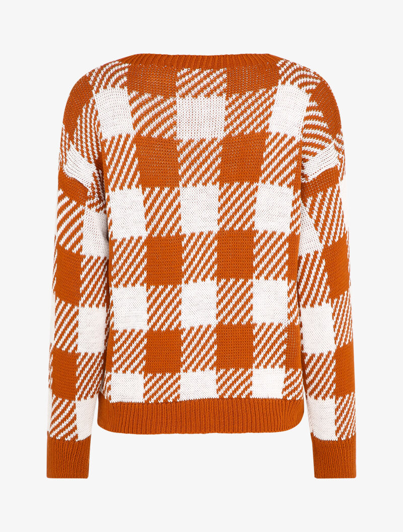 Adoptez l'audace du motif damier revisité avec ce pull rouille fabriqué en Italie. Sa coupe droite et son col rond offrent un confort optimal, tandis que les poignets et bords côtelés assurent une finition soignée. L'imprimé damier stylisé apporte une touche graphique moderne à vos tenues automnales. Les manches longues garantissent chaleur et protection. Confectionné en acrylique de qualité, ce pull combine style contemporain et praticité au quotidien. Parfait pour composer des looks urbains décontractés ou des ensembles casual chic selon vos envies.