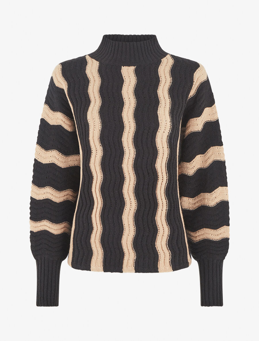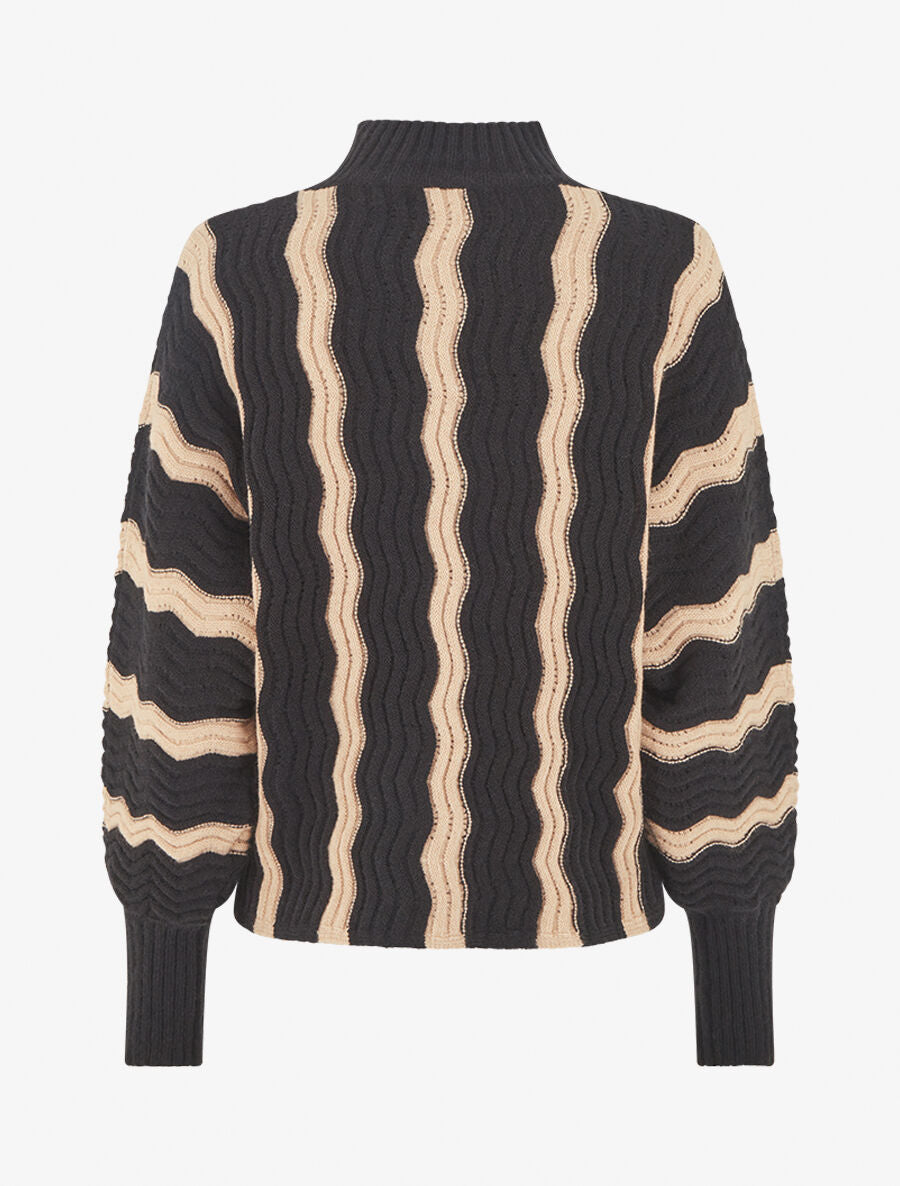 Ce pull noir rayé affiche une silhouette décontractée grâce à sa coupe droite ample qui assure confort et liberté de mouvement. Son col montant apporte une touche moderne et protectrice, tandis que les manches longues garantissent une couverture optimale. Les rayures graphiques structurent l'ensemble avec caractère. Idéal pour composer des looks casual chic au quotidien, ce pull se marie facilement avec un jean ou un pantalon fluide. Une pièce polyvalente qui traverse les saisons avec style.