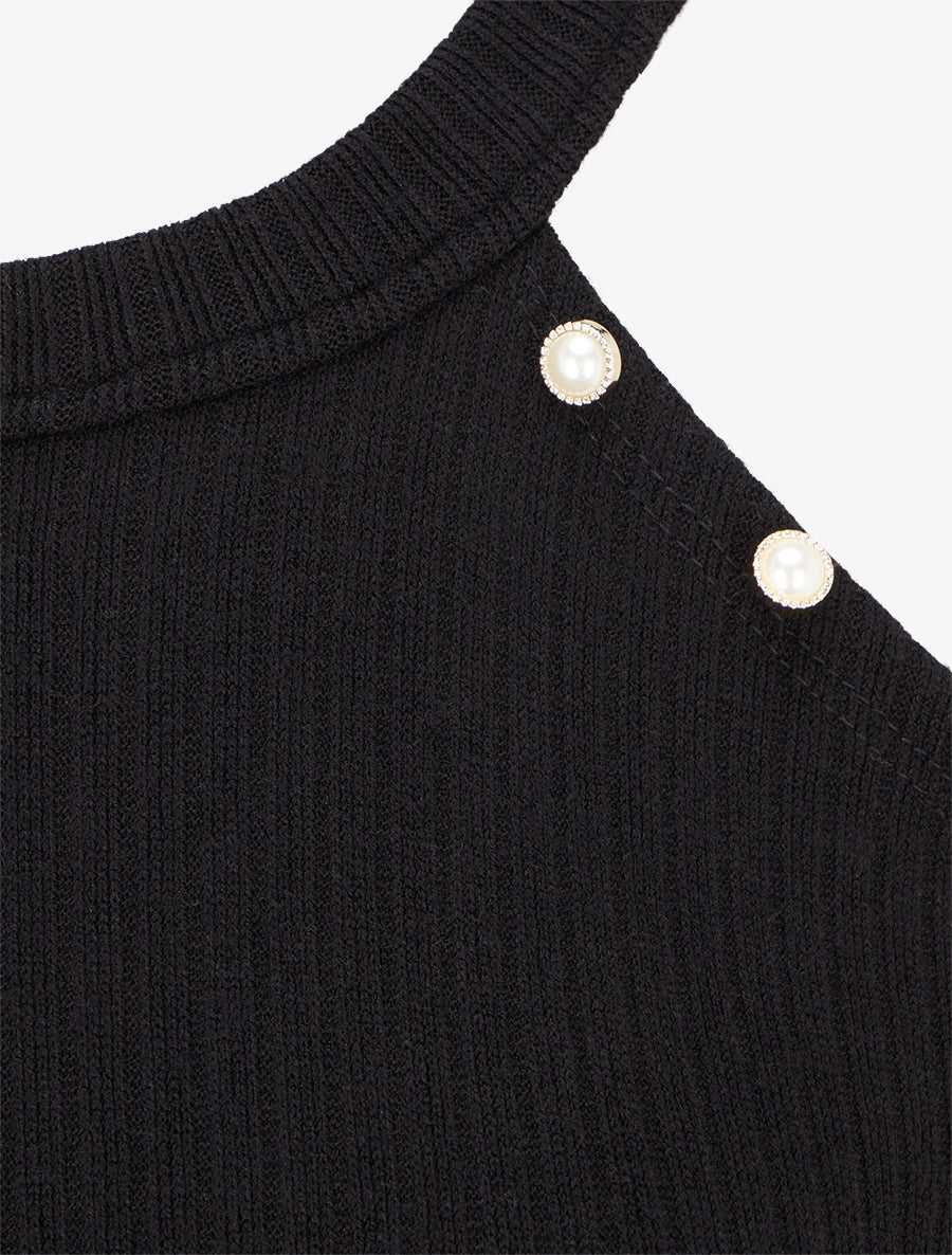 Ce pull côtelé noir à la coupe moulante révèle un design audacieux avec ses épaules dénudées et son encolure ronde sophistiquée. Les manches longues apportent l'équilibre parfait entre couverture et sensualité. L'empiècement orné de perles ajoute une touche précieuse et raffinée à l'ensemble. Confectionné en Italie avec un savoir-faire d'exception, ce pull marie viscose, polyester et nylon pour un confort optimal et un tombé impeccable. Idéal pour vos soirées comme pour sublimer vos tenues quotidiennes avec une touche de caractère.