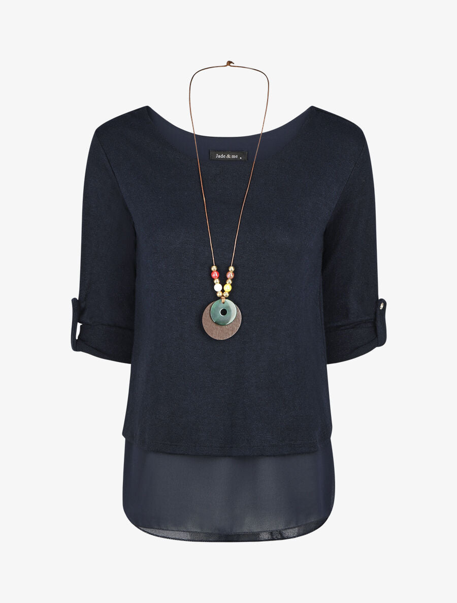 Ce pull marine séduit par sa coupe droite intemporelle et son col rond élégant. Les manches longues retroussables offrent une polyvalence appréciable au quotidien. Sa doublure en voile apparente apporte une touche raffinée et contemporaine. Un sautoir peut varier selon le modèle pour personnaliser votre look. Confectionné en Italie avec un savoir-faire reconnu, ce pull allie confort et qualité. Parfait pour composer des tenues décontractées ou sophistiquées selon vos envies. Une pièce polyvalente qui traverse les saisons avec style.
