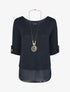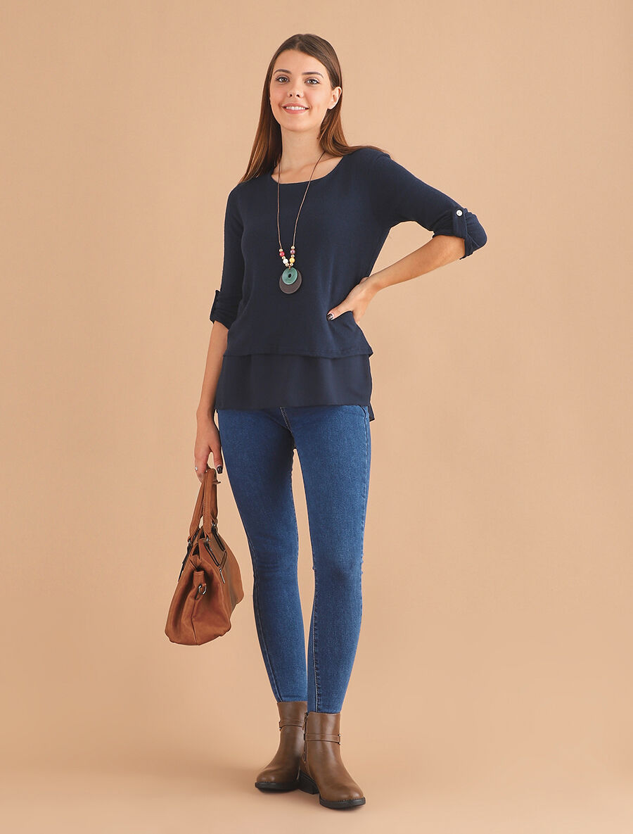 Pull uni col rond manches retroussables - Marine