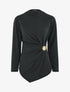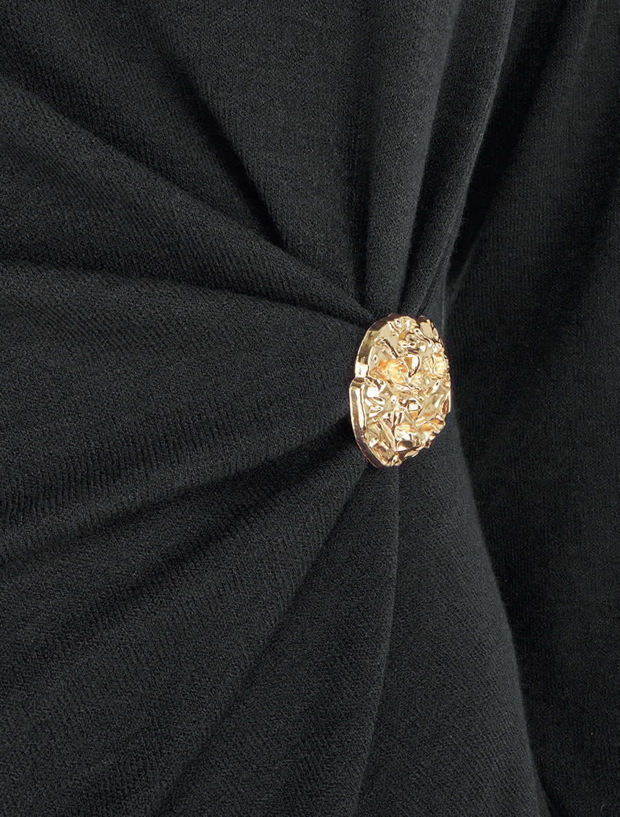Ce pull fin noir se distingue par son empiècement asymétrique à effet plissé rehaussé d'une broche élégante. Sa coupe droite et son col montant apportent une touche sophistiquée, tandis que les manches longues assurent confort et style. Confectionné en Italie avec un mélange technique alliant polyester, viscose et élasthanne, ce pull offre une belle tenue et une liberté de mouvement appréciable. Parfait pour sublimer vos tenues de bureau comme vos sorties du soir, il s'associe aussi bien à un pantalon tailleur qu'à une jupe crayon. Une pièce raffinée qui réinvente le vestiaire féminin contemporain.