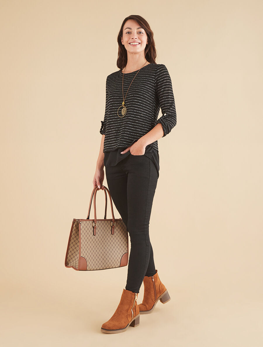 Succombez à l'élégance intemporelle de ce pull à rayures irisées qui sublime votre silhouette grâce à sa coupe droite flatteuse. Son col rond classique s'accompagne de manches longues retroussables pour un style modulable selon vos envies. Les rayures irisées apportent une touche lumineuse et moderne, tandis que la doublure en voile assure un confort optimal. Parfait pour vos journées au bureau ou vos sorties décontractées, ce pull fabriqué en Italie incarne le savoir-faire transalpin. Un essentiel polyvalent à adopter sans hésiter dans votre garde-robe.