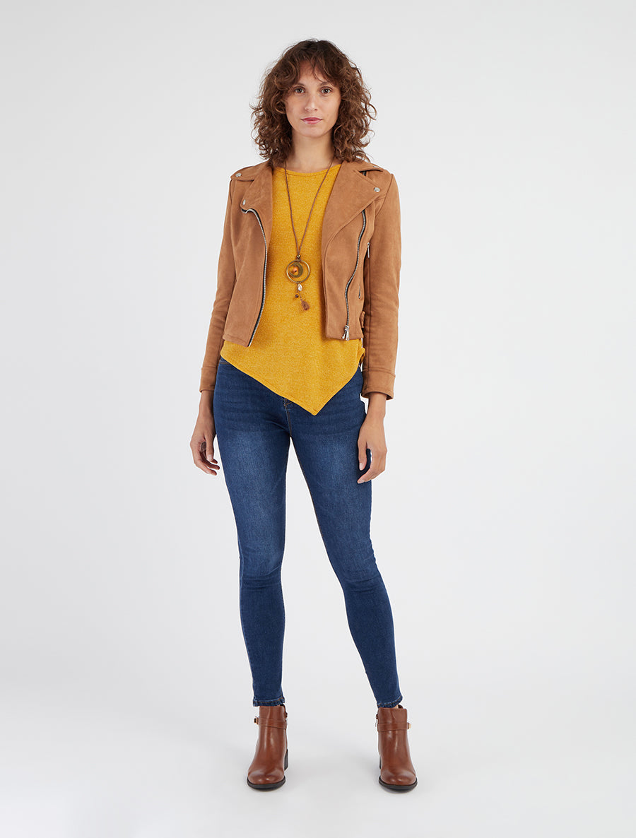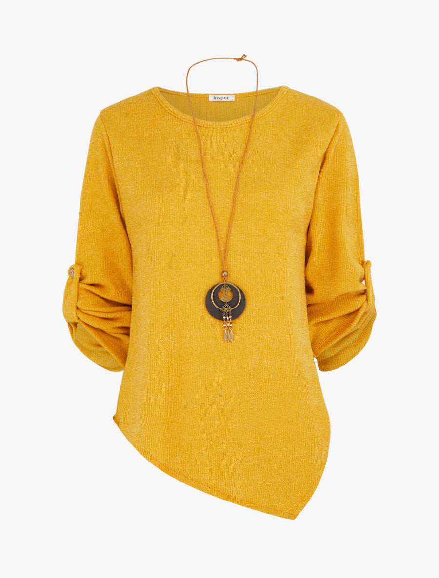 Pull asymétrique col rond manches retroussables - Jaune moutarde