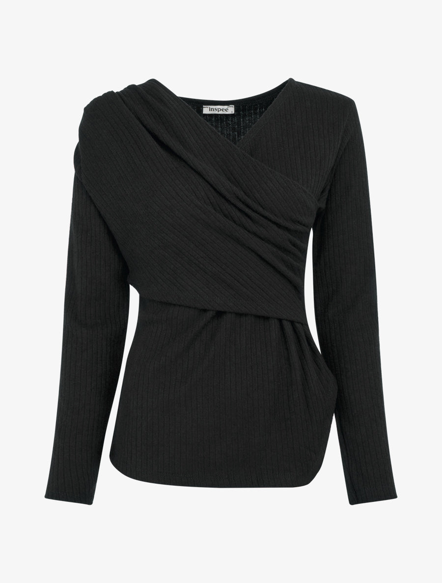 Pull fin côtelé à cache-cœur stylisé - Noir - 1